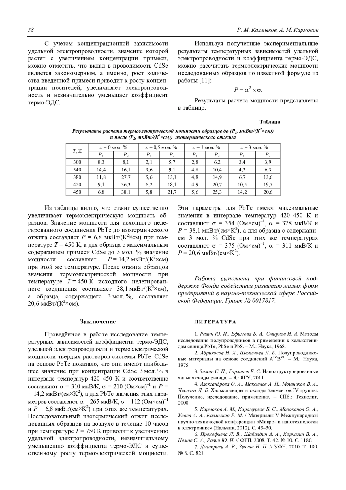 Калмыков Р. М., Кармоков А. М. Влияние изотермического отжига на электропроводность и термо-ЭДС PbTe, легированного CdSe 55