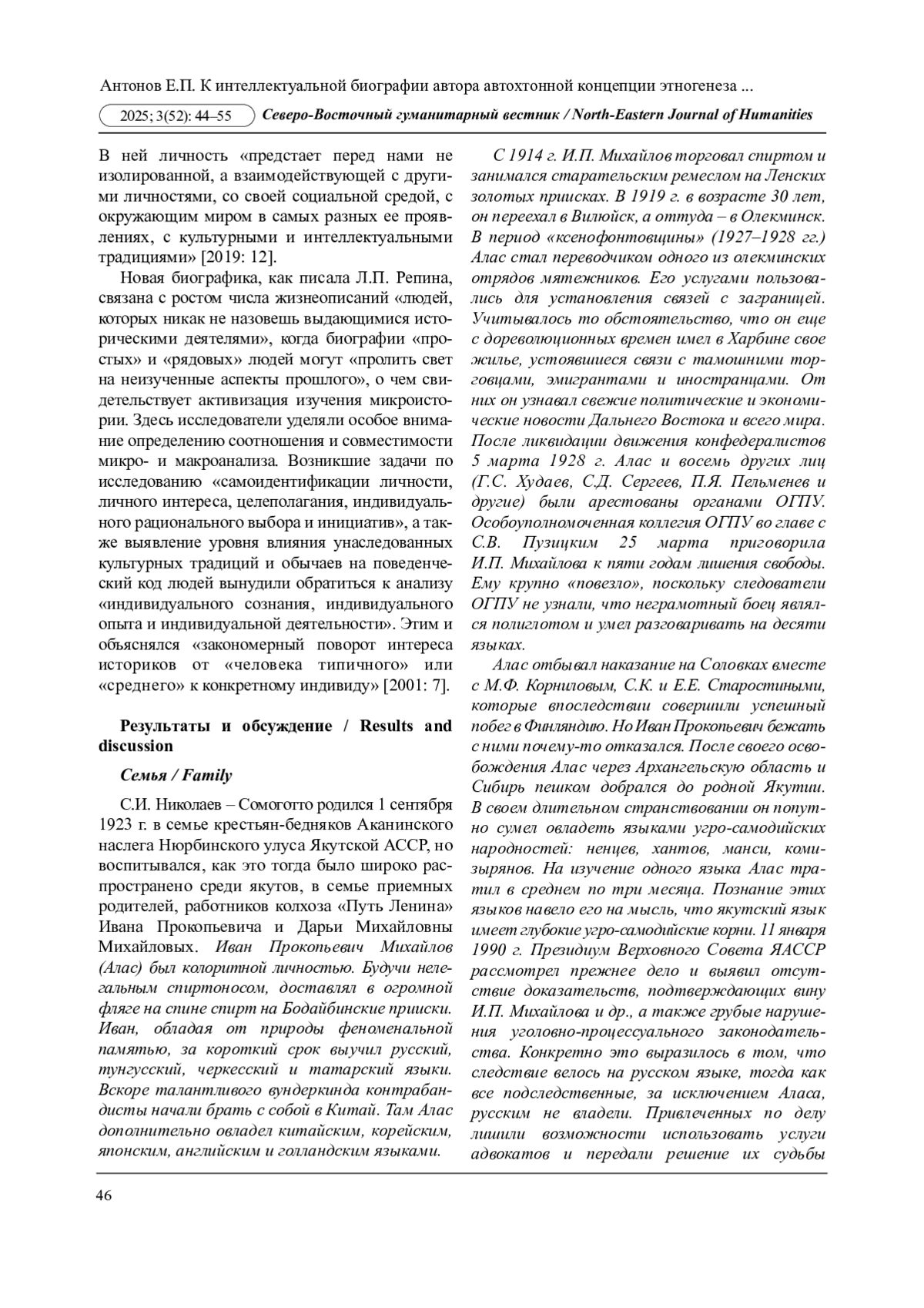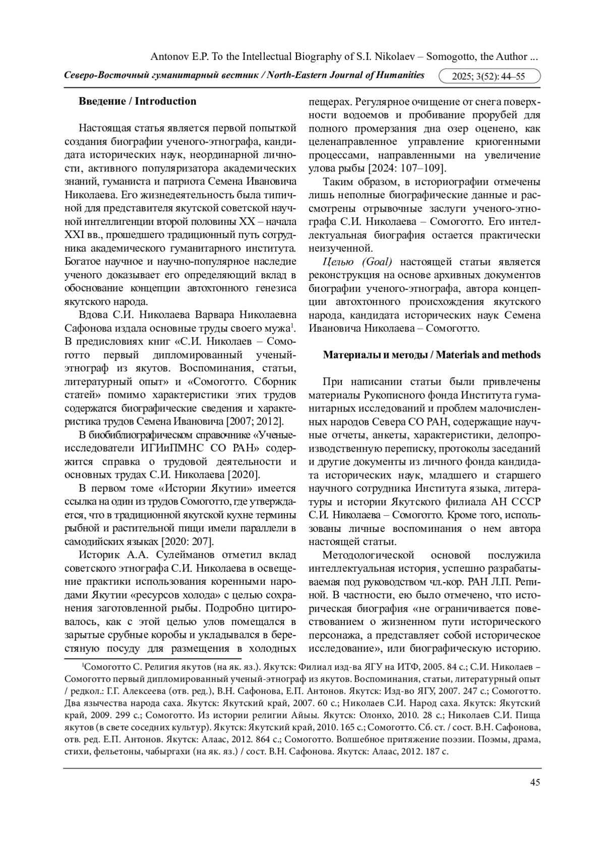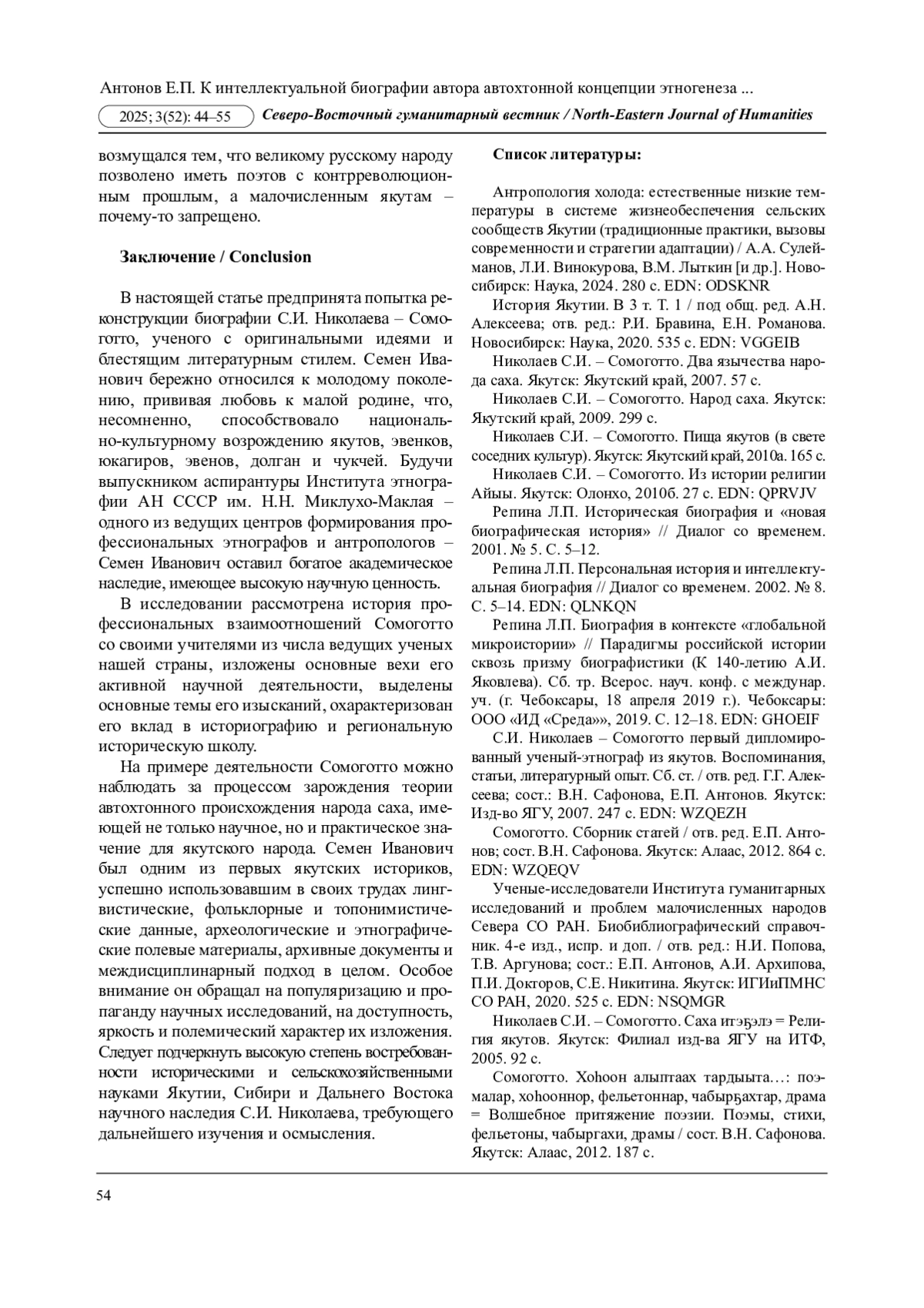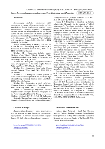 11. С.И. Николаев - Сомоготто первый дипломированный ученый-этнограф из якутов. Воспоминания, статьи, литературный опыт. Сб. ст. / отв. ред. Г.Г. Алексеева; сост.: В.Н. Сафонова, Е.П. Антонов. Якутск: Изд-во ЯГУ, 2007. 247 с. EDN: WZQEZH