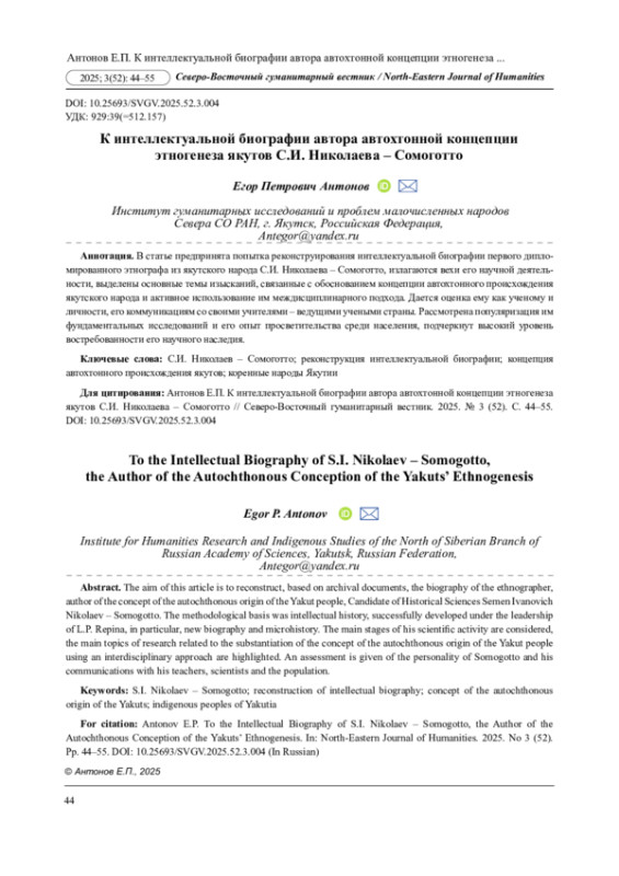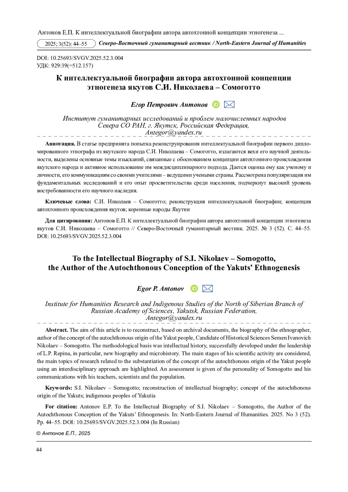 В статье предпринята попытка реконструирования интеллектуальной биографии первого дипломированного этнографа из якутского народа С. И. Николаева - Сомоготто, излагаются вехи его научной деятельности, выделены основные темы изысканий, связанные с обоснованием концепции автохтонного происхождения якутского народа и активное использование им междисциплинарного подхода. Дается оценка ему как ученому и личности, его коммуникациям со своими учителями - ведущими учеными страны. Рассмотрена популяризация им фундаментальных исследований и его опыт просветительства среди населения, подчеркнут высокий уровень востребованности его научного наследия.