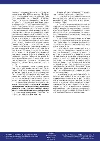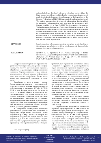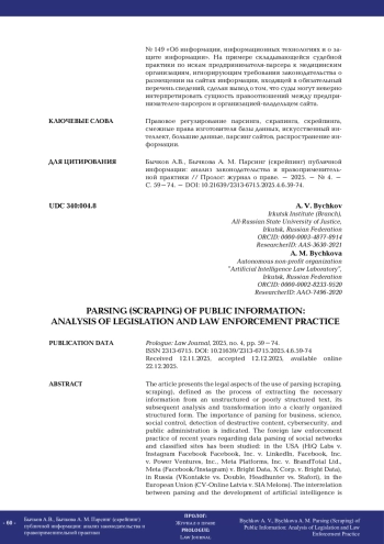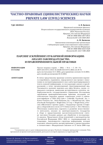 В статье представлены правовые аспекты применения парсинга (скрейпинга, скрапинга), определяемого как процесс извлечения из неструктурированного или слабоструктурированного текста нужной информации, ее последующие анализ и преобразование в четко организованный структурированный вид. Указывается значение парсинга для сфер бизнеса, науки, социального контроля, выявления деструктивного контента, кибербезопасности, государственного управления. Исследована зарубежная правоприменительная практика последних лет относительно парсинга данных социальных сетей и сайтовклассифайдов: в США (hiQ Labs v. LinkedIn, Facebook1, Inc. v. Power Ventures, Inc., Meta Platforms, Inc. v. BrandTotal Ltd., Meta (Facebook/Instagram) v. Bright Data, X Corp. v. Bright Data), в России («ВКонтакте» против «Дабл», «Хедхантер» против «Стафори»), в Европейском союзе («CV-Online Latvia» v. SIA «Melons»). Обоснована взаимосвязь парсинга и развития искусственного интеллекта, указано на заинтересованность государства в сборе и предоставлении высокотехнологическому сектору массивов больших данных для обработки и последующего анализа. Представлен обзор изменений в законодательстве Российской Федерации 2024–2025 гг., подтверждающий эту тенденцию. Анализируется структура информации, которая подлежит обязательному распространению и предоставлению в соответствии с Федеральным Законом от 27 июля 2006 года № 149 «Об информации, информационных технологиях и о защите информации». На примере складывающейся судебной практики по искам предпринимателя-парсера к медицинским организациям, игнорирующим требования законодательства о размещении на сайтах информации, входящей в обязательный перечень сведений, сделан вывод о том, что суды могут неверно интерпретировать сущность правоотношений между предпринимателем-парсером и организацией-владельцем сайта.