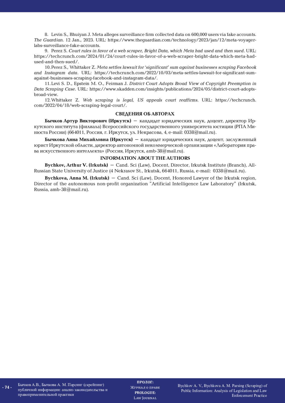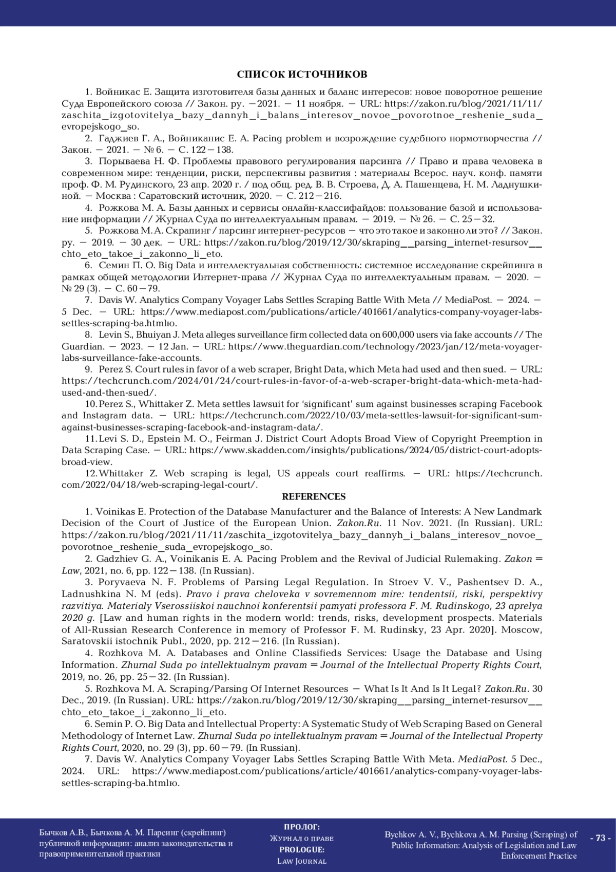 5. Рожкова М. А. Скрапинг / парсинг интернет-ресурсов - что это такое и законно ли это? // Закон.ру. - 2019. - 30 дек. -URL: https://zakon.ru/blog/2019/12/30/skraping__parsing_internet-resursov__chto_eto_takoe_i_zakonno_li_eto. EDN: XYMPUW