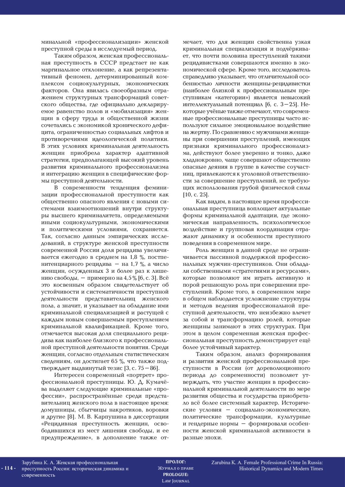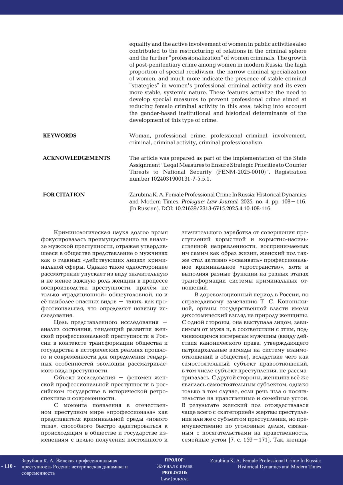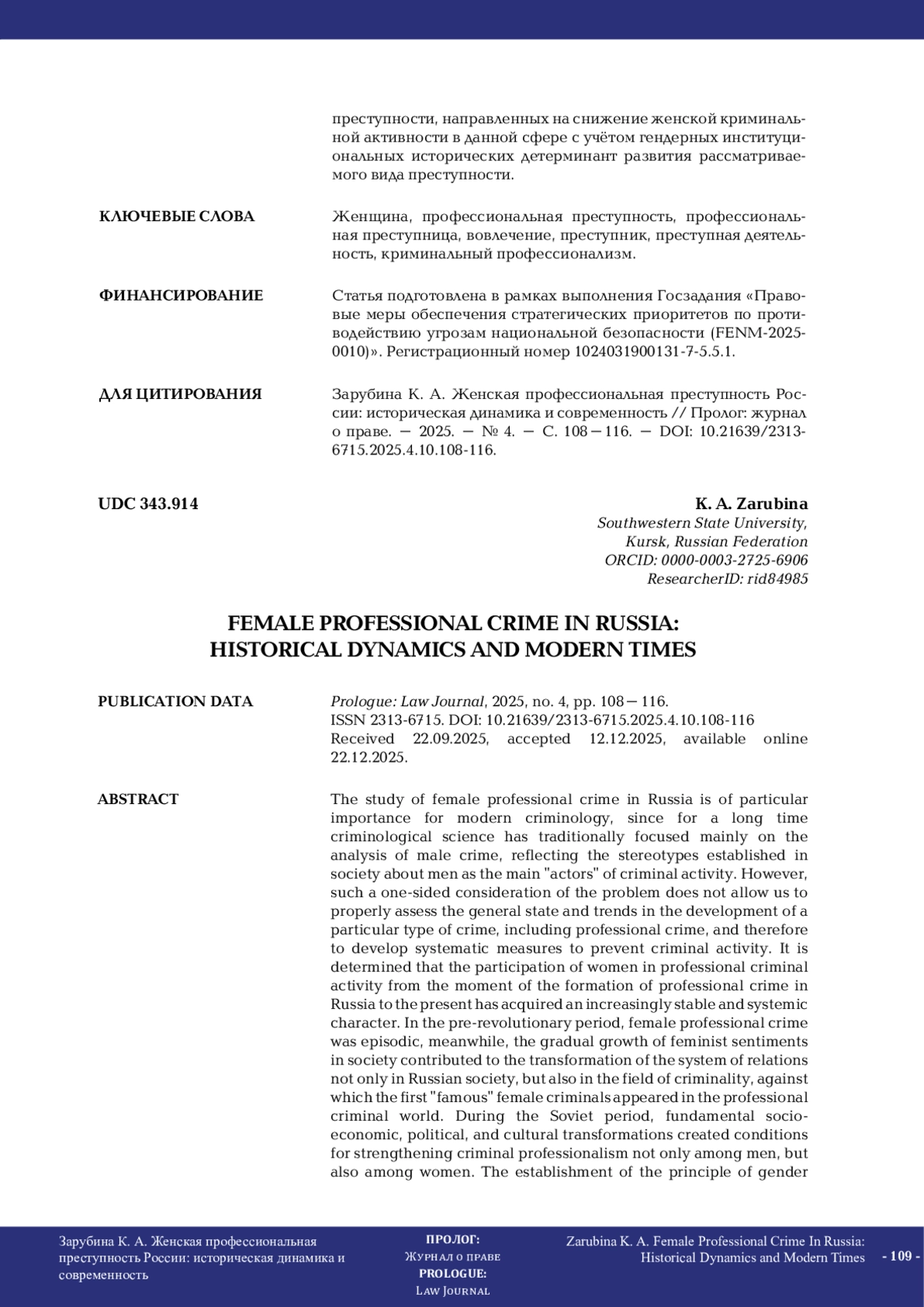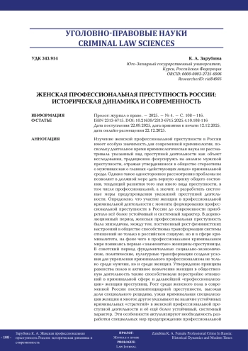 Изучение женской профессиональной преступности в России имеет особую значимость для современной криминологии, поскольку длительное время криминологическая наука не рассматривала указанный вид преступной деятельности как объект исследования, традиционно фокусируясь на анализе мужской преступности, отражая утвердившиеся в обществе стереотипы о мужчинах как о главных «действующих лицах» криминальной среды. Однако такое одностороннее рассмотрение проблемы не позволяет в должной мере дать верную оценку общего состояния, тенденций развития того или иного вида преступности, в том числе профессиональной, а значит, и разработать системные меры предупреждения указанной преступной деятельности. Определено, что участие женщин в профессиональной криминальной деятельности с момента формирования профессиональной преступности в России до современности приобретало всё более устойчивый и системный характер. В дореволюционный период женская профессиональная преступность была эпизодична, между тем, постепенный рост феминистских настроений в обществе способствовал трансформации системы отношений не только в российском социуме, но и в сфере криминалитета, на фоне чего в профессиональном криминальном мире появились первые «знаменитые» женщины-преступницы. В советский период фундаментальные социально-экономические, политические, культурные трансформации создали условия для укрепления криминального профессионализма не только среди мужчин, но и среди женщин. Утверждение принципа равенства полов и активное вовлечение женщин в общественную деятельность также способствовали перестройке отношений в криминальной сфере и дальнейшей «профессионализации» женщин-преступниц. Рост среди женского пола в современной России постпенитенциарной преступности, высокая доля специального рецидива, узкая криминальная специализация женщин и многое другое указывают на наличие устойчивых криминальных «стратегий» в женской профессиональной преступной деятельности и её ещё более устойчивый, системный характер. Эти особенности актуализируют необходимость разработки специальных мер предупреждения профессиональной преступности, направленных на снижение женской криминальной активности в данной сфере с учётом гендерных институциональных исторических детерминант развития рассматриваемого вида преступности.