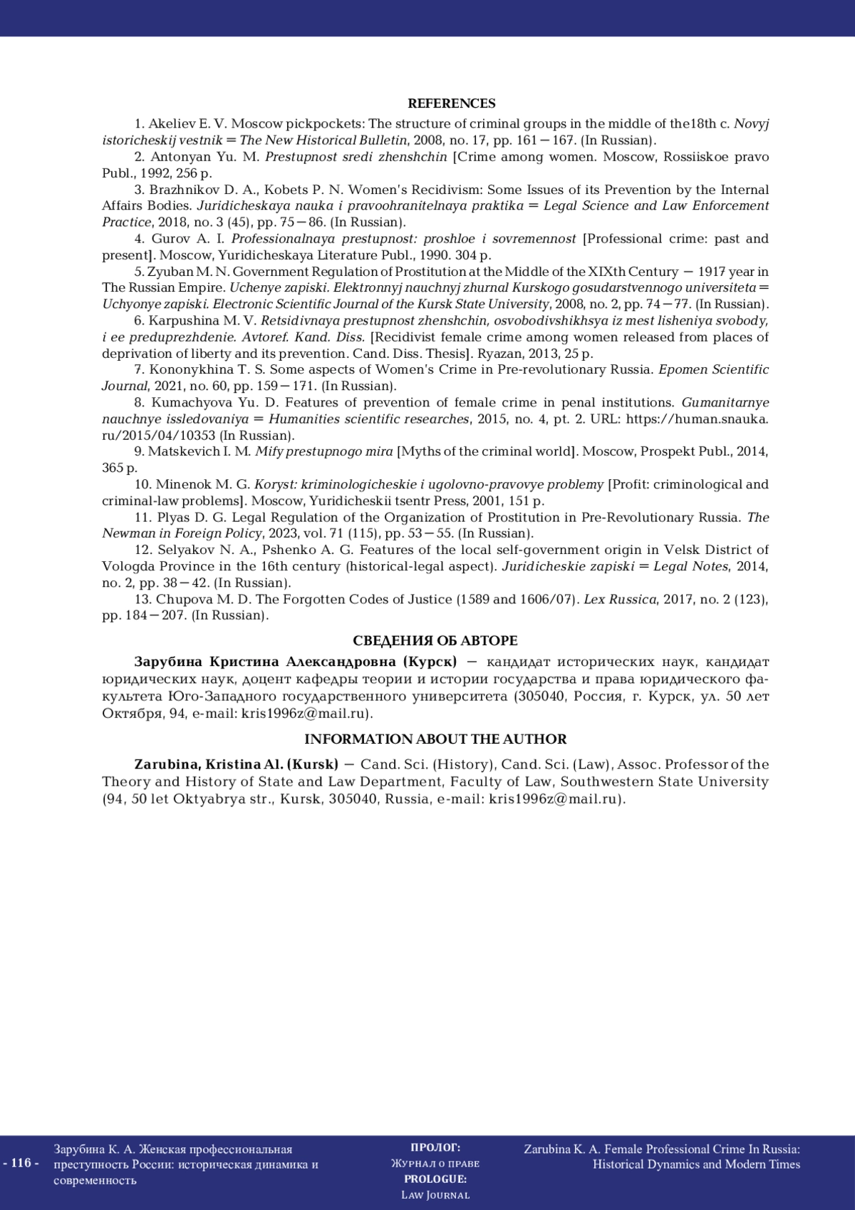 7. Кононыхина Т. С. Некоторые аспекты женской преступности в дореволюционной России // Эпомен. - 2021. - № 60. - С. 159-171.
