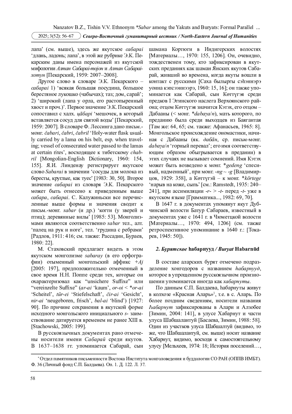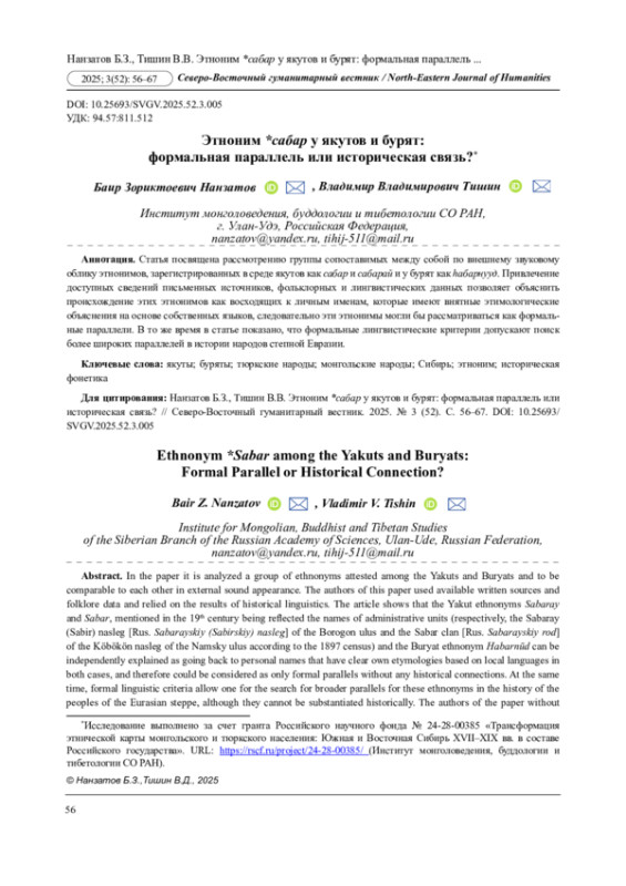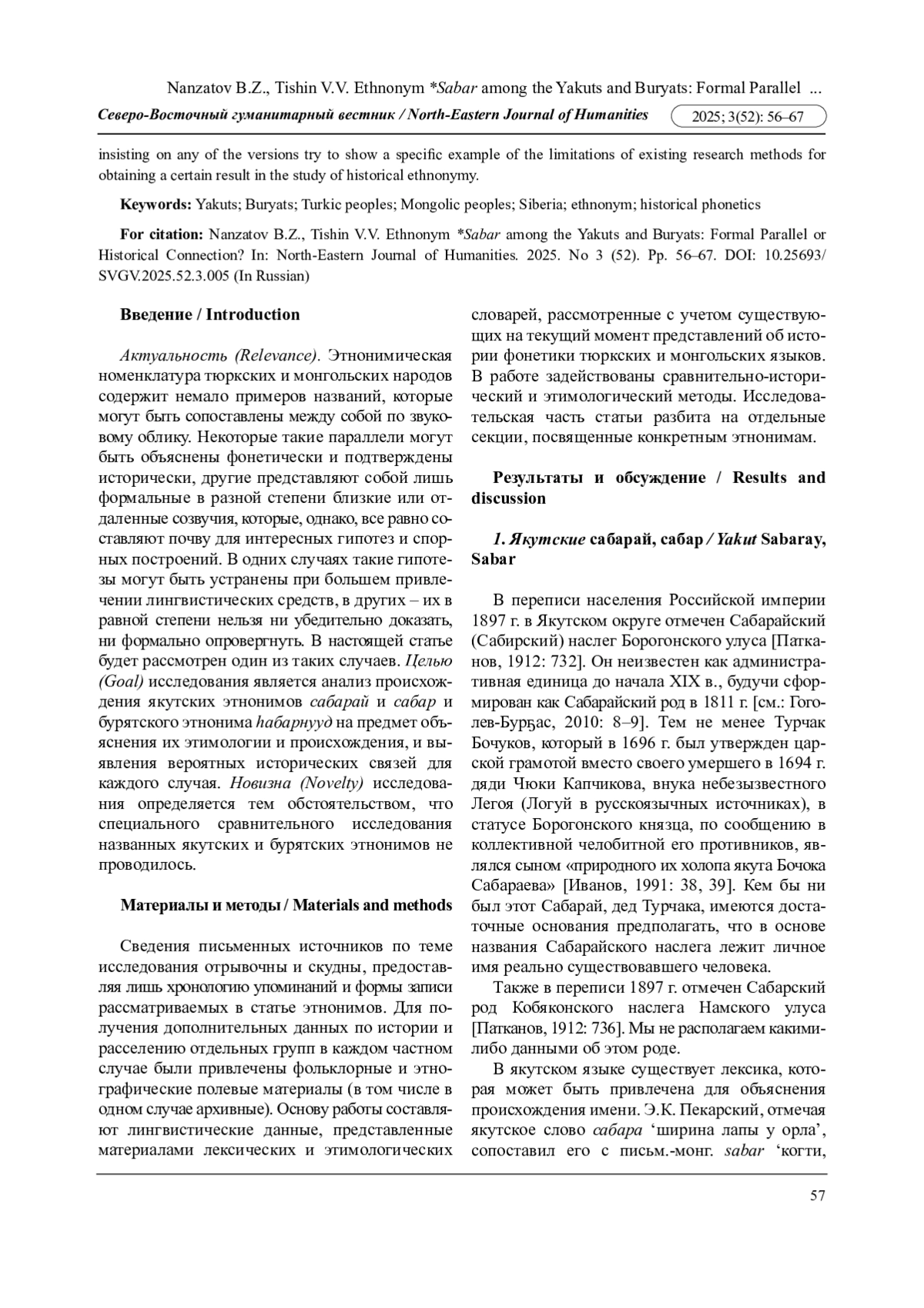 Статья посвящена рассмотрению группы сопоставимых между собой по внешнему звуковому облику этнонимов, зарегистрированных в среде якутов как сабар и сабарай и у бурят как hабарнууд. Привлечение доступных сведений письменных источников, фольклорных и лингвистических данных позволяет объяснить происхождение этих этнонимов как восходящих к личным именам, которые имеют внятные этимологические объяснения на основе собственных языков, следовательно эти этнонимы могли бы рассматриваться как формальные параллели. В то же время в статье показано, что формальные лингвистические критерии допускают поиск более широких параллелей в истории народов степной Евразии.