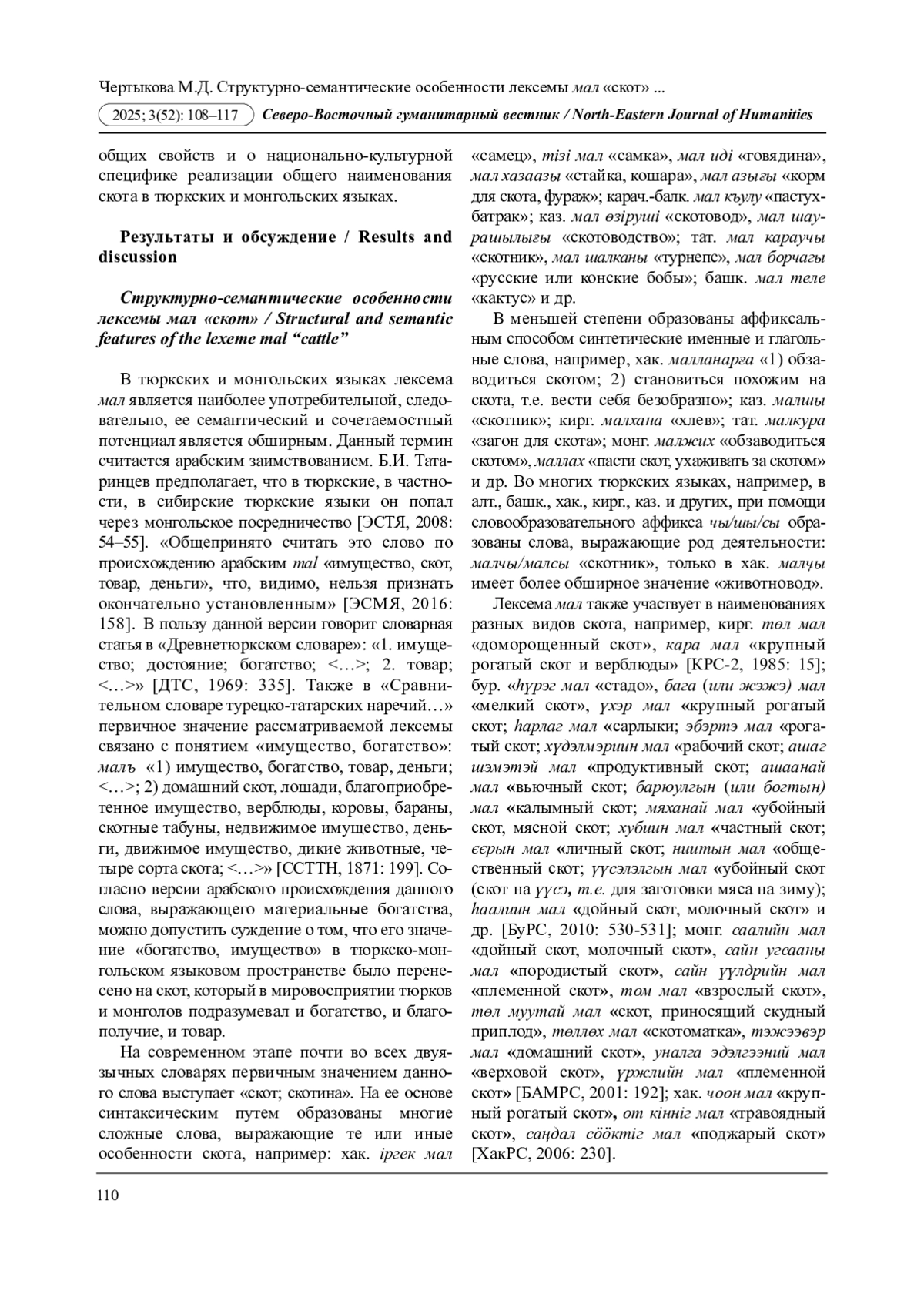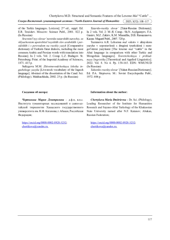 33. Тазранова А.Р. Лексема мал “скот” в алтайском языке в сопоставлении с другими тюркскими и монгольскими языками // Теоретическая и прикладная лингвистика, 2022, Т. 8. № 4. С. 158-165. EDN: WMUNUD