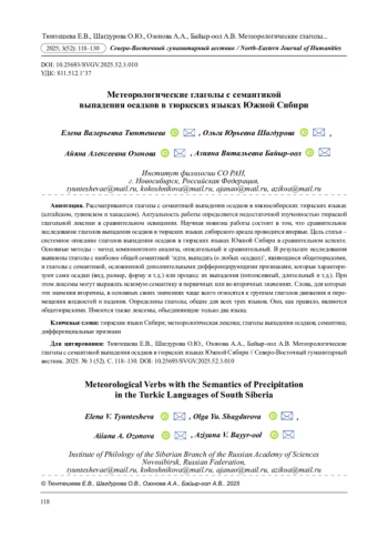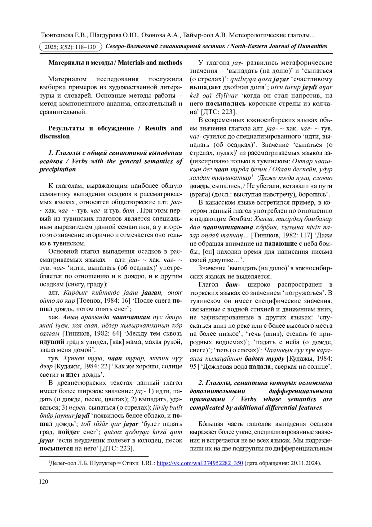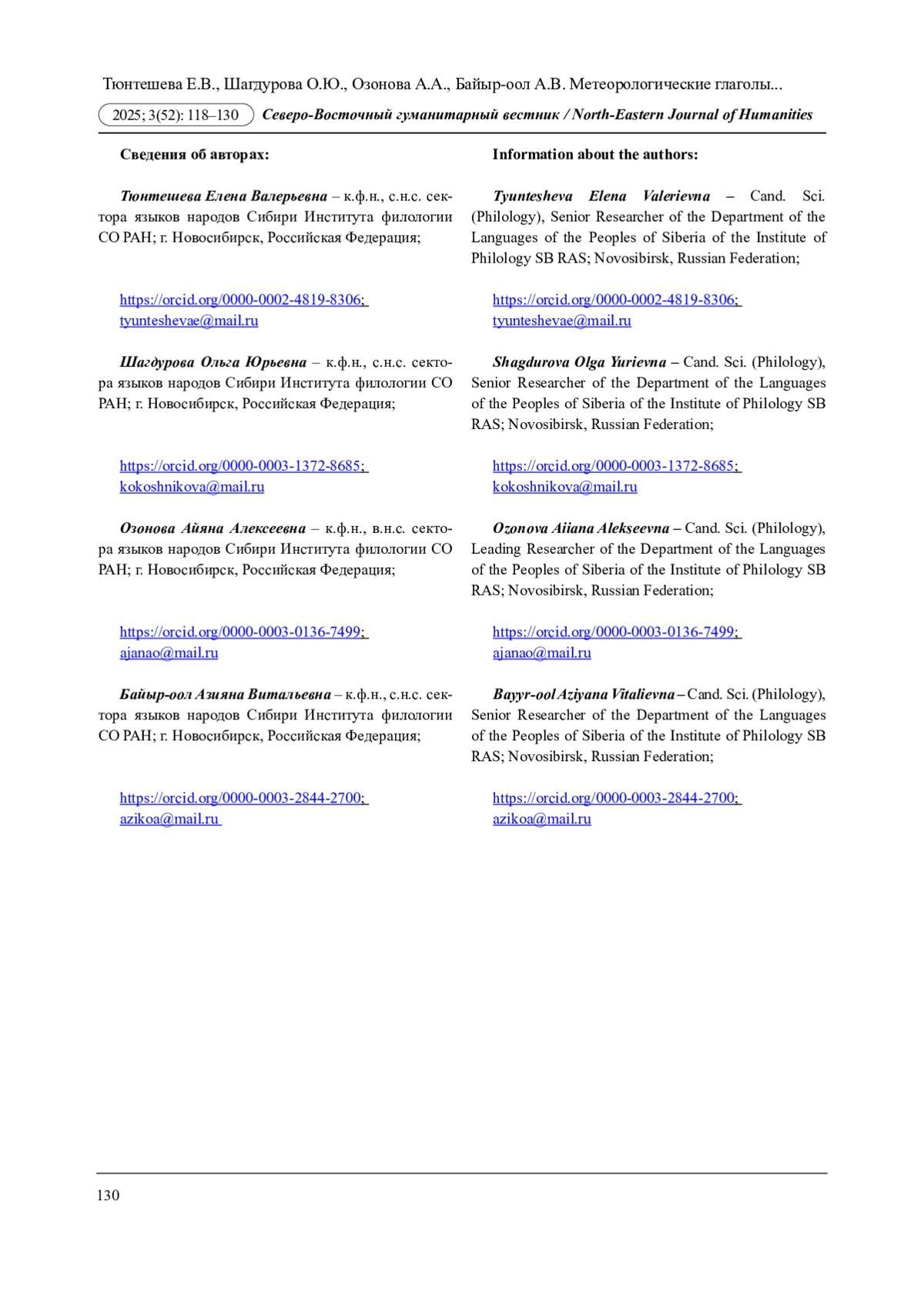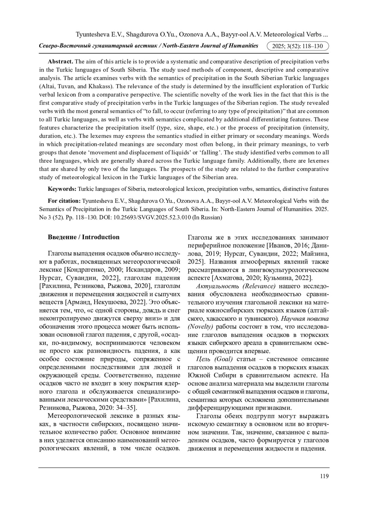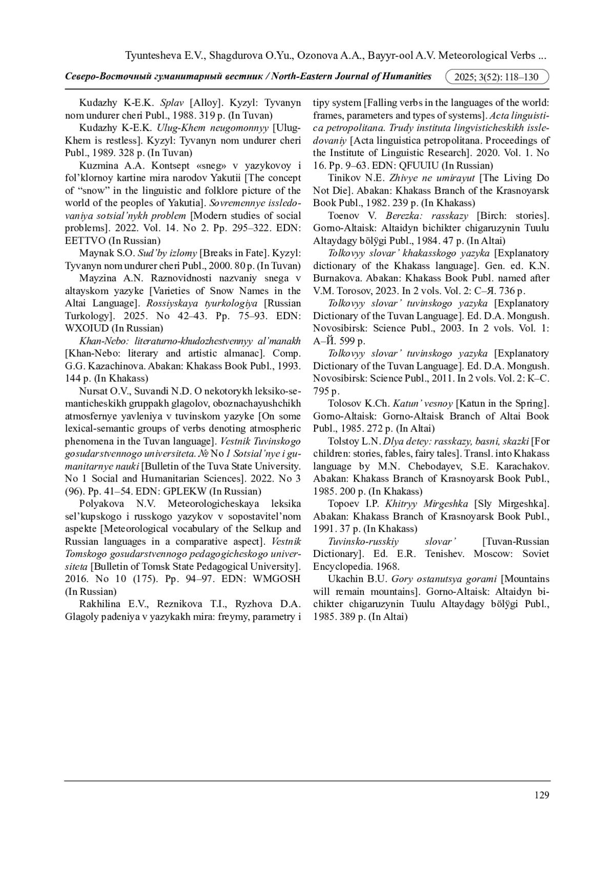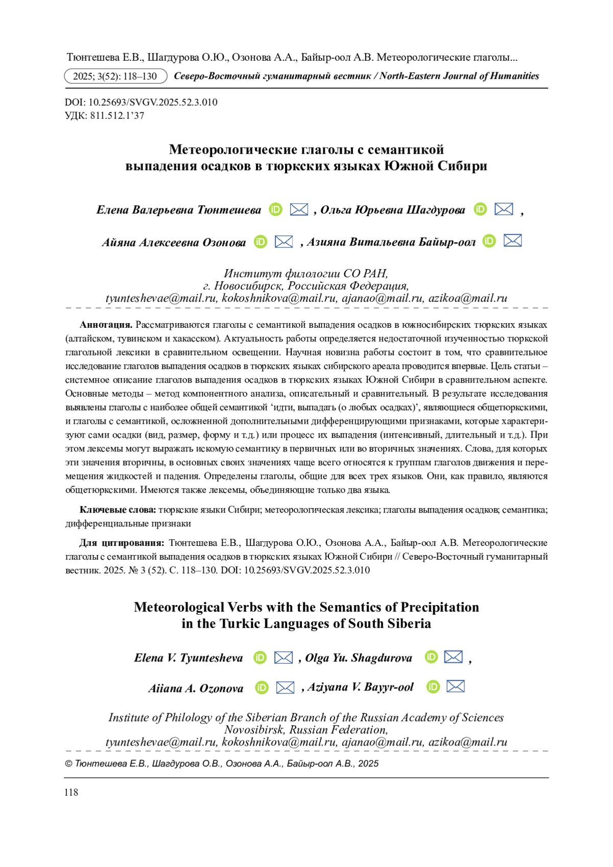 33. Нурсат О.В., Сувандии Н.Д. О некоторых лексико-семантических группах глаголов, обозначающих атмосферные явления в тувинском языке // Вестник Тувинского гос. ун-та. № 1 Социальные и гуманитарные науки. 2022. № 3 (96). С. 41-54. EDN: GPLEKW
