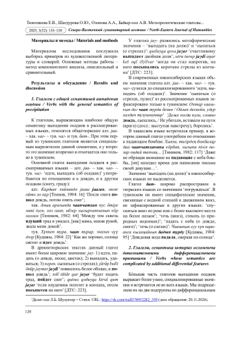 Цель статьи - системное описание глаголов выпадения осадков в тюркских языках Южной Сибири в сравнительном аспекте. Основные методы - метод компонентного анализа, описательный и сравнительный. В результате исследования выявлены глаголы с наиболее общей семантикой ‘идти, выпадать (о любых осадках)’, являющиеся общетюркскими, и глаголы с семантикой, осложненной дополнительными дифференцирующими признаками, которые характеризуют сами осадки (вид, размер, форму и т. д.) или процесс их выпадения (интенсивный, длительный и т. д.). При этом лексемы могут выражать искомую семантику в первичных или во вторичных значениях. Слова, для которых эти значения вторичны, в основных своих значениях чаще всего относятся к группам глаголов движения и перемещения жидкостей и падения. Определены глаголы, общие для всех трех языков. Они, как правило, являются общетюркскими. Имеются также лексемы, объединяющие только два языка.