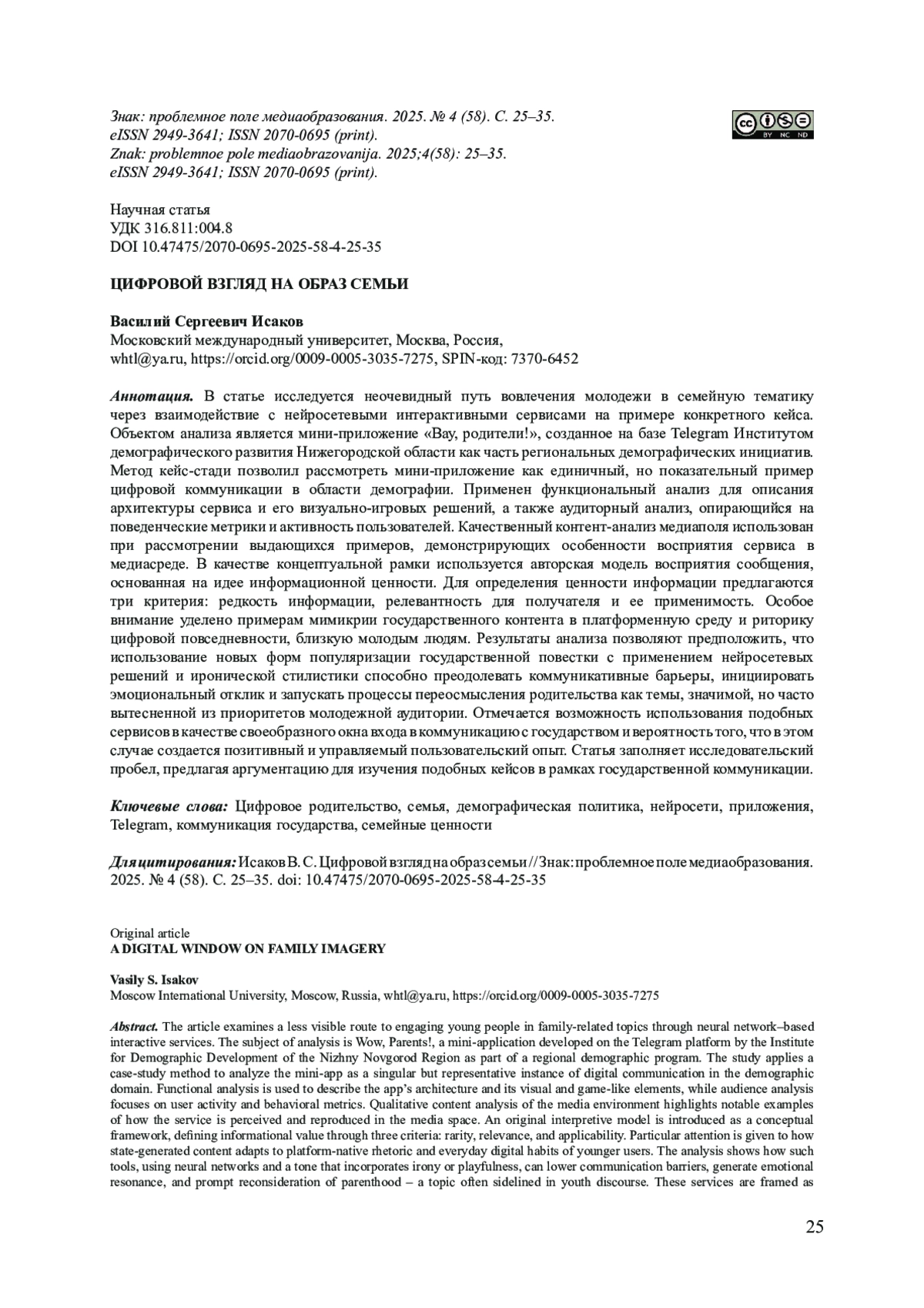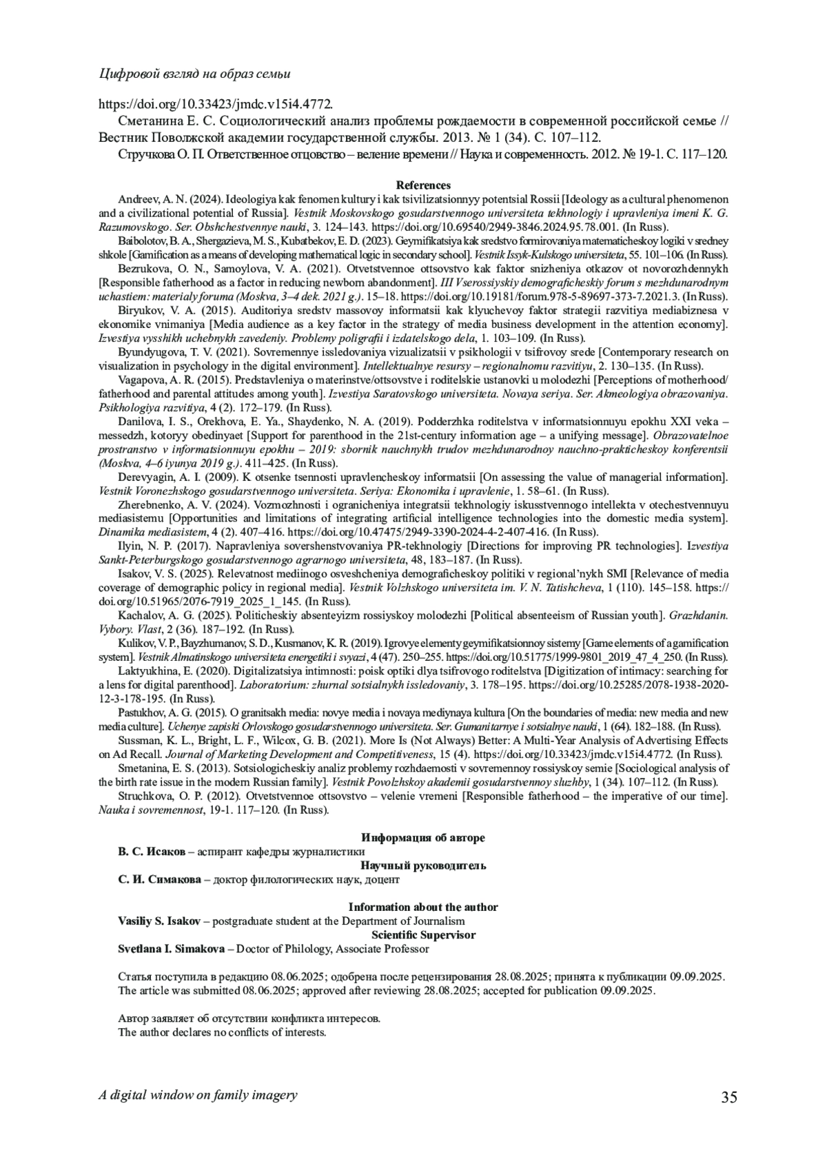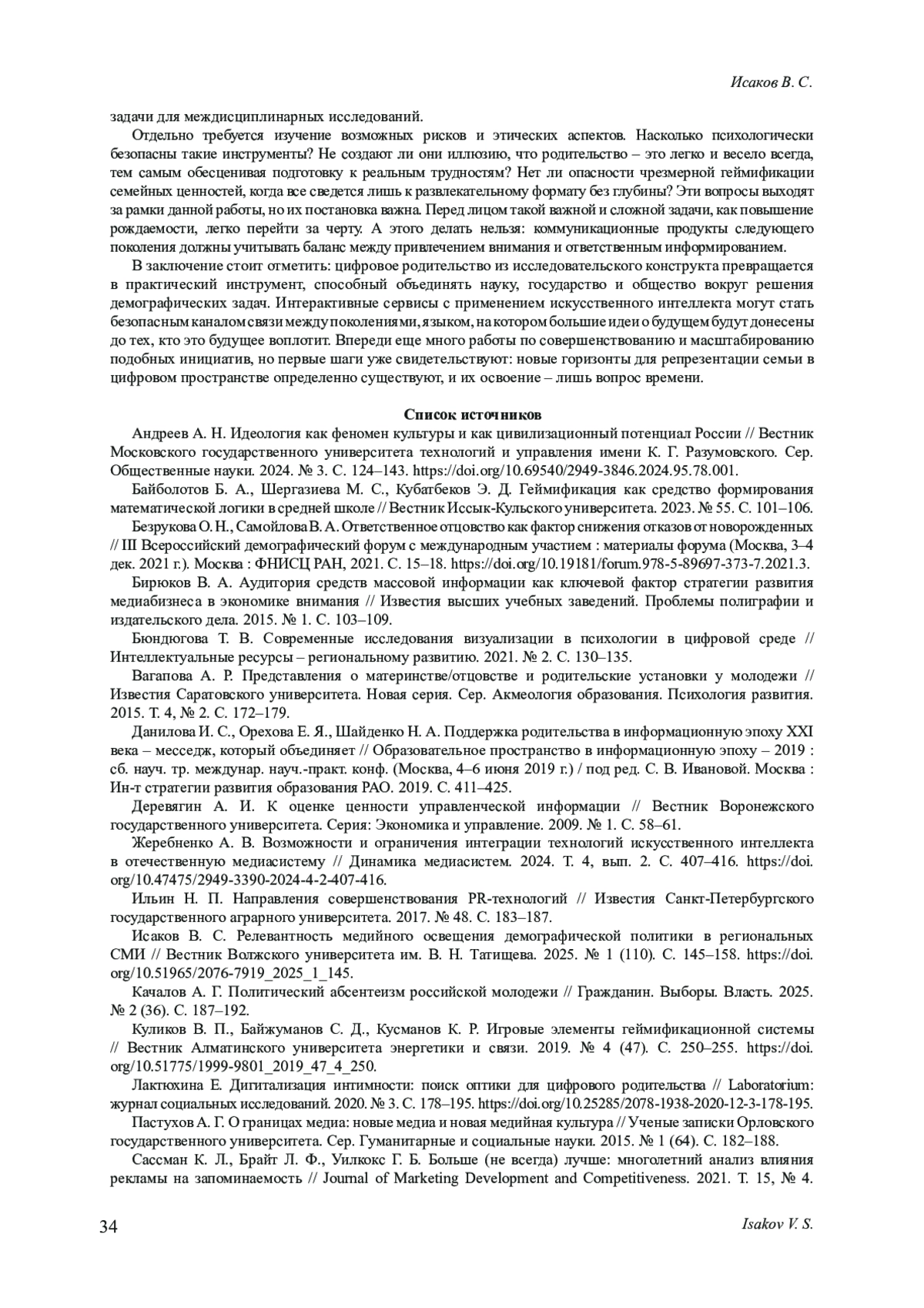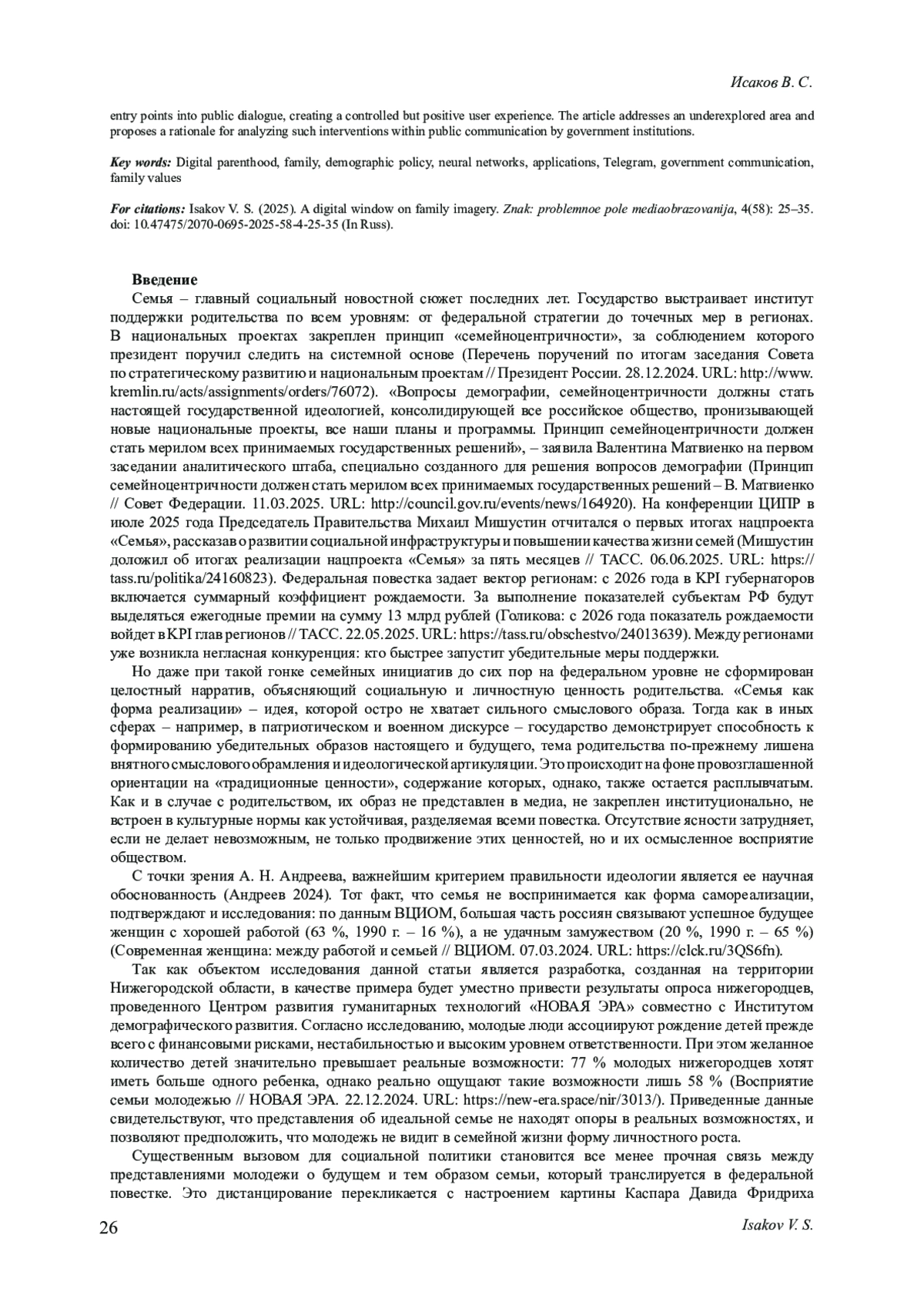 11. Исаков В. С. Релевантность медийного освещения демографической политики в региональных СМИ // Вестник Волжского университета им. В. Н. Татищева. 2025. № 1 (110). С. 145-158. DOI: 10.51965/2076-7919_2025_1_145 EDN: JDVIED