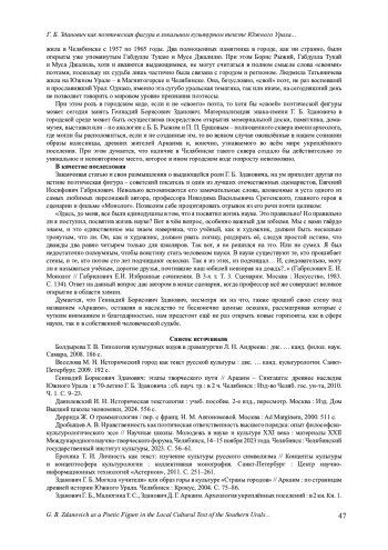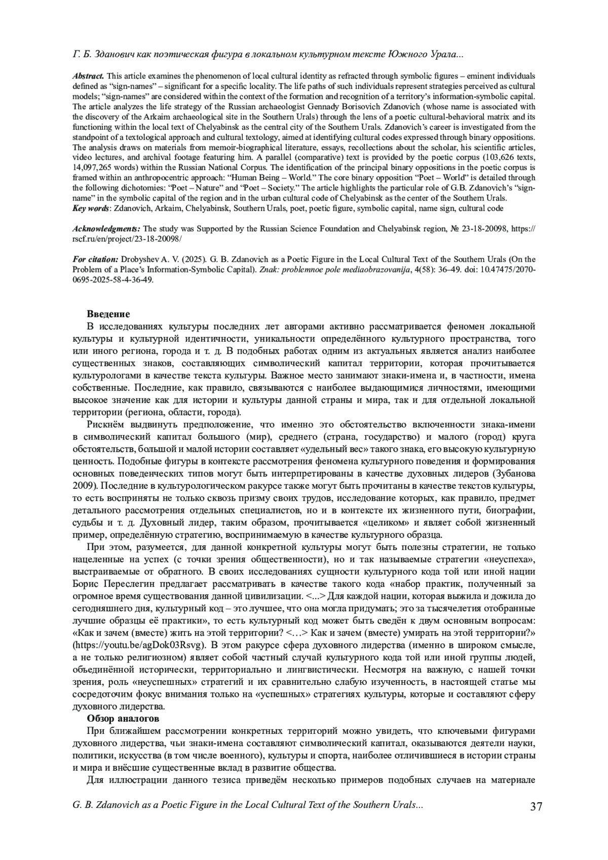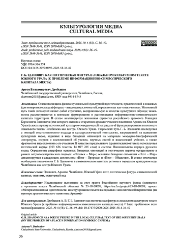 Статья посвящена феномену локальной культурной идентичности, преломленной в знаковых (для конкретного локуса) фигурах - выдающихся личностей, определяемых как «знаки-имена». Жизненный путь таких личностей являет собой стратегию, воспринимаемую в качестве культурного образца; знаки-имена рассматриваются в контексте формирования и распознавания информационно-символического капитала территории. В статье анализируется жизненная стратегия российского археолога Геннадия Борисовича Здановича (имя которого связано с открытием археологического памятника Аркаим на Южном Урале) сквозь призму поэтической культурно-поведенческой матрицы и её функционирования в контексте локального текста Челябинска как центра Южного Урала. Творческий путь Г. Б. Здановича исследуется с позиций текстологического подхода и культурологической текстологии, направленной на выявление культурных кодов, заданных в виде бинарных оппозиций на материале мемуарно-биографической литературы, очерков и воспоминаний об ученом, научных статей и видеолекций учёного, а также фрагментов видеохроники с его участием. В качестве параллельного (сравнительного) текста используется поэтический корпус (103 626 текстов, 14 097 265 слов) в системе Национального корпуса русского языка. Определение специфики основных бинарных оппозиций в поэтическом корпусе осуществлено в рамках антропоцентрического подхода: «Человек - Мир»; основная бинарная оппозиция «Поэт - Мир» детализируется в следующих дихотомиях: «Поэт - Природа» и «Поэт - Общество». В статье отмечается особая роль знака-имени Г. Б. Здановича в символическом капитале региона и городском культурном коде Челябинска как центра Южного Урала.