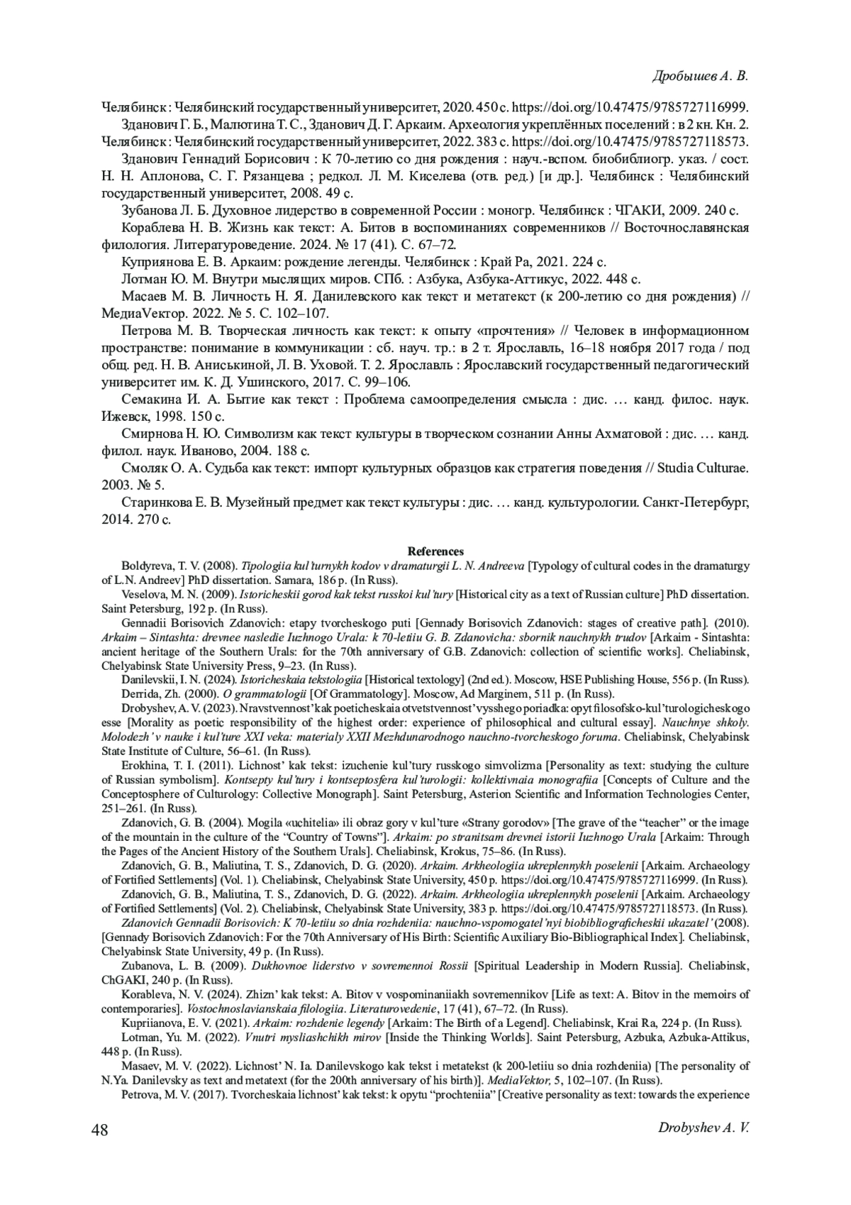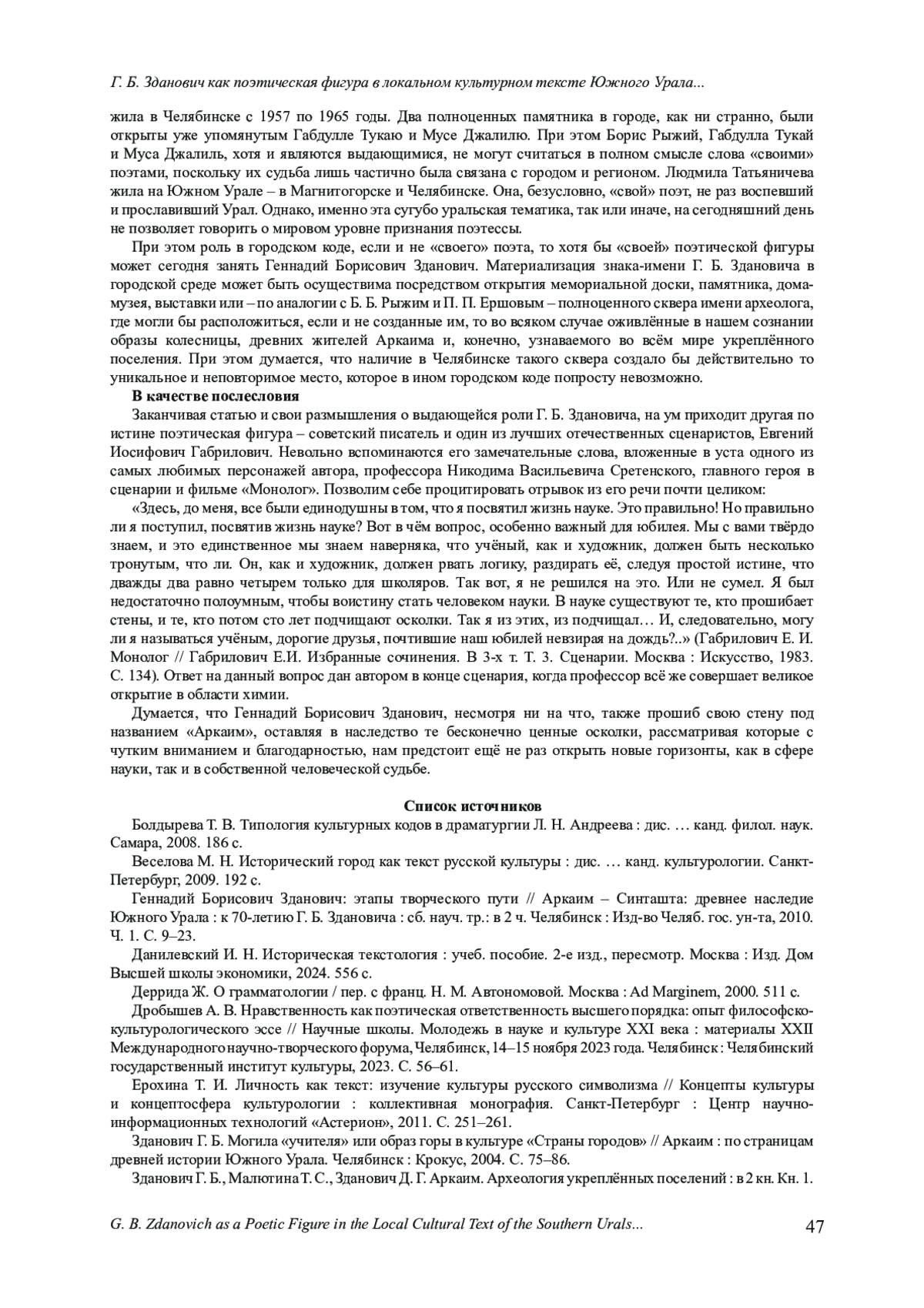 3. Геннадий Борисович Зданович: этапы творческого пути // Аркаим - Синташта: древнее наследие Южного Урала: к 70-летию Г. Б. Здановича: сб. науч. тр.: в 2 ч. Челябинск: Изд-во Челяб. гос. ун-та, 2010. Ч. 1. С. 9-23.