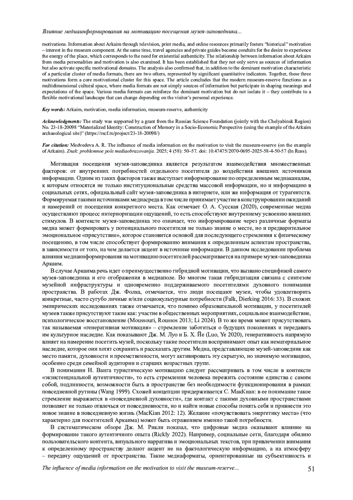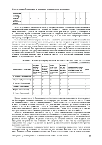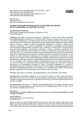 Настоящее исследование направлено на выявление и анализ связи между источниками медиаинформирования (социальные сети, печатные СМИ, телевидение, туристические агентства и др.) и мотивации потенциальных посетителей Аркаима. В качестве материалов анализа используются данные опроса посетителей (N=926) за 2023-2024 гг. Несмотря на подтверждение мотивационного ядра посещения Аркаима (близость к природе, музейная составляющая пространства и интерес к энергии места), результаты показывают, что различные медиаформаты способствуют доминированию различающихся типов мотиваций. Информирование об Аркаиме через телевидение, печатные СМИ и интернет-ресурсы преимущественно формирует «историческую» мотивацию - интерес к музейной составляющей. В то же время туристические агентства и частные гиды становятся проводниками стремления почувствовать энергетику места, что соответствует потребности в экзистенциальной аутентичности. Также рассмотрена связь между информированием об Аркаиме от медийных личностей и мотивацией. Установлено, что они являются не только источниками информации, но и активируют определенные мотивационные домены. Анализ также подтвердил, что помимо доминирующей мотивации, характерной для определенного кластера медиаформатов, существуют две другие, представленные значительными количественными показателями. Эти три мотивации вместе образуют ядерный мотивационный кластер для данного пространства. В статье делается вывод, что современный музей-заповедник функционирует как многомерное культурное пространство, где медиаформаты становятся не просто источниками информации, но участвуют в формировании смыслов и ожиданий от пространства. Различные форматы медиаинформирования могут усиливать доминирующую мотивацию, но не изолируют её - они вносят вклад в гибкую мотивационную картину, которая может измениться в зависимости от личного опыта посетителя.