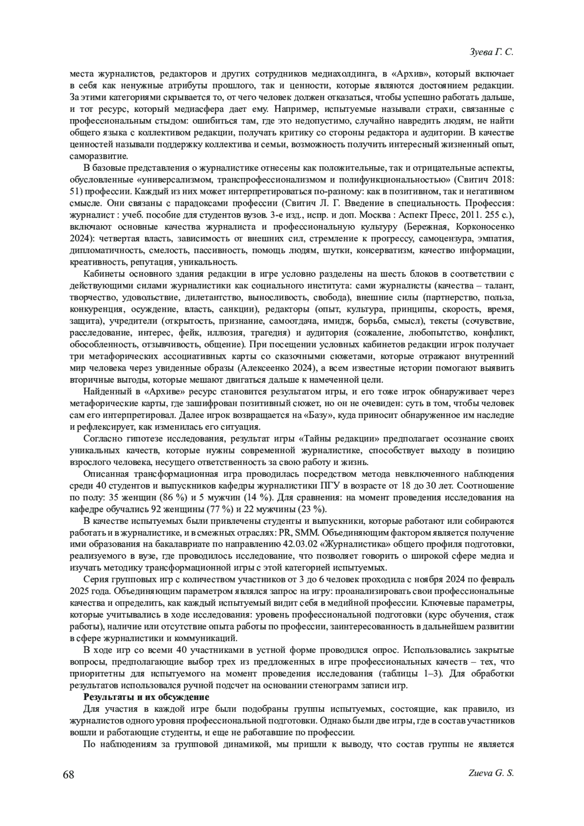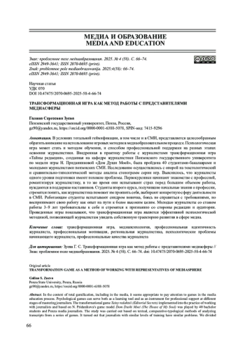 В условиях тотальной геймификации, в том числе и в СМИ, представляется целесообразным обратить внимание на использование игровых методик в медиаобразовательном процессе. Психологическая игра может стать и методом обучения, и способом профессиональной поддержки на разных этапах освоения журналистики. Внедренная в практику работы с журналистами трансформационная игра«Тайны редакции», созданная на кафедре журналистики Пензенского государственного университета по модели игры Н. Приданниковой «Дом Души Моей», была пройдена 40 студентами-бакалаврами и молодыми журналистами пензенских СМИ. Исследование осуществлялось с опорой на текстологический и сравнительно-типологический методы анализа стенограмм серии игр. Выяснилось, что журналисты одного уровня подготовки имеют похожие проблемы. Первокурсники начинают знакомство с профессией, романтизируя журналистику, в то же время они испытывают страх перед большим объемом работы, нуждаются в поддержке наставников. Студенты второго курса, получившие начальные знания о профессии, стремятся понять, как журналистика поможет им проявить себя, выбирают конкретную сферу деятельности в СМИ. Работающие студенты испытывают синдром новичка, боясь не справиться с требованиями, но воспринимают свою работу как опыт на пути к более высоким целям. Молодые журналисты со стажем работы 3-9 лет требовательны к себе и стремятся к признанию со стороны редакции и аудитории. Проведенные игры показывают, что трансформационная игра является эффективной психологической методикой, позволяющей журналистам увидеть собственную траекторию развития в сфере медиа.