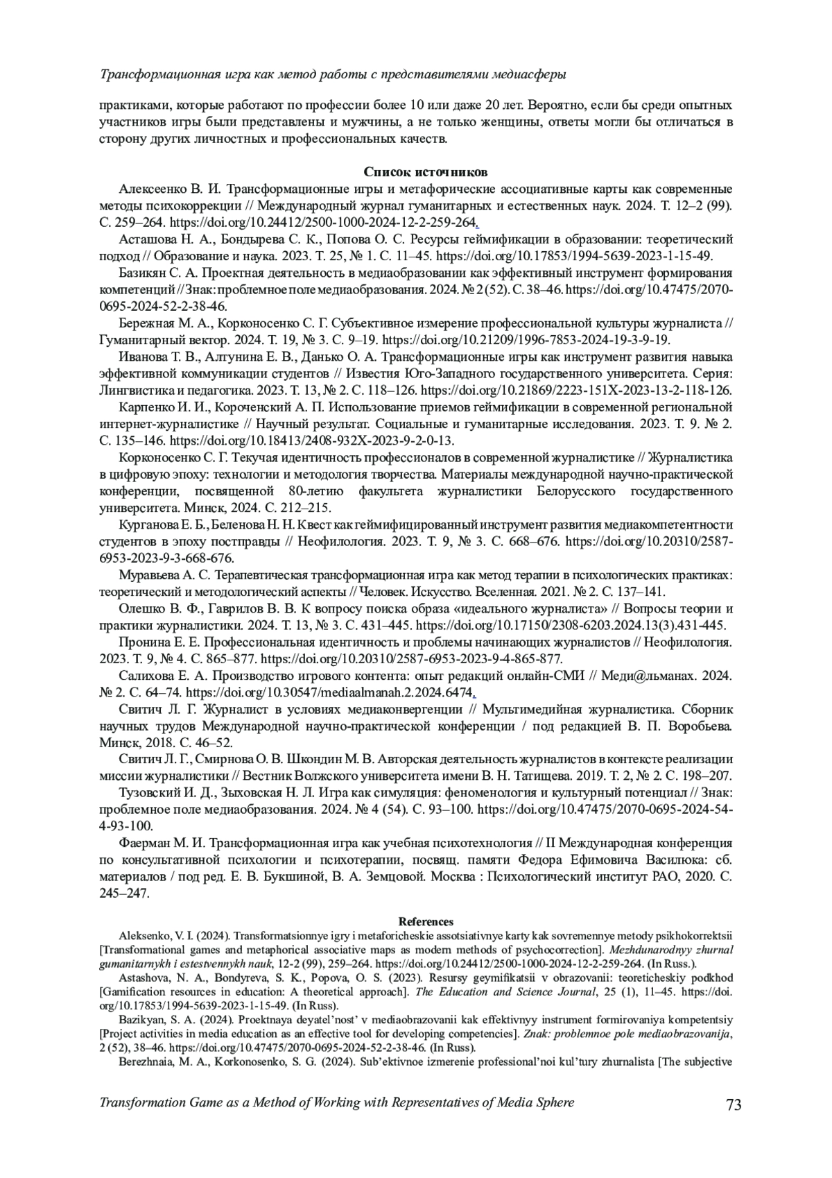 1. Алексеенко В. И. Трансформационные игры и метафорические ассоциативные карты как современные методы психокоррекции // Международный журнал гуманитарных и естественных наук. 2024. Т. 12-2 (99). С. 259-264. DOI: 10.24412/2500-1000-2024-12-2-259-264 EDN: JSWRUA