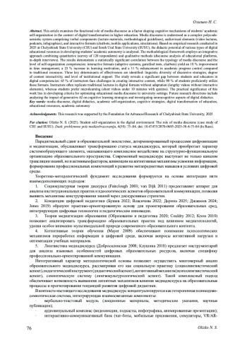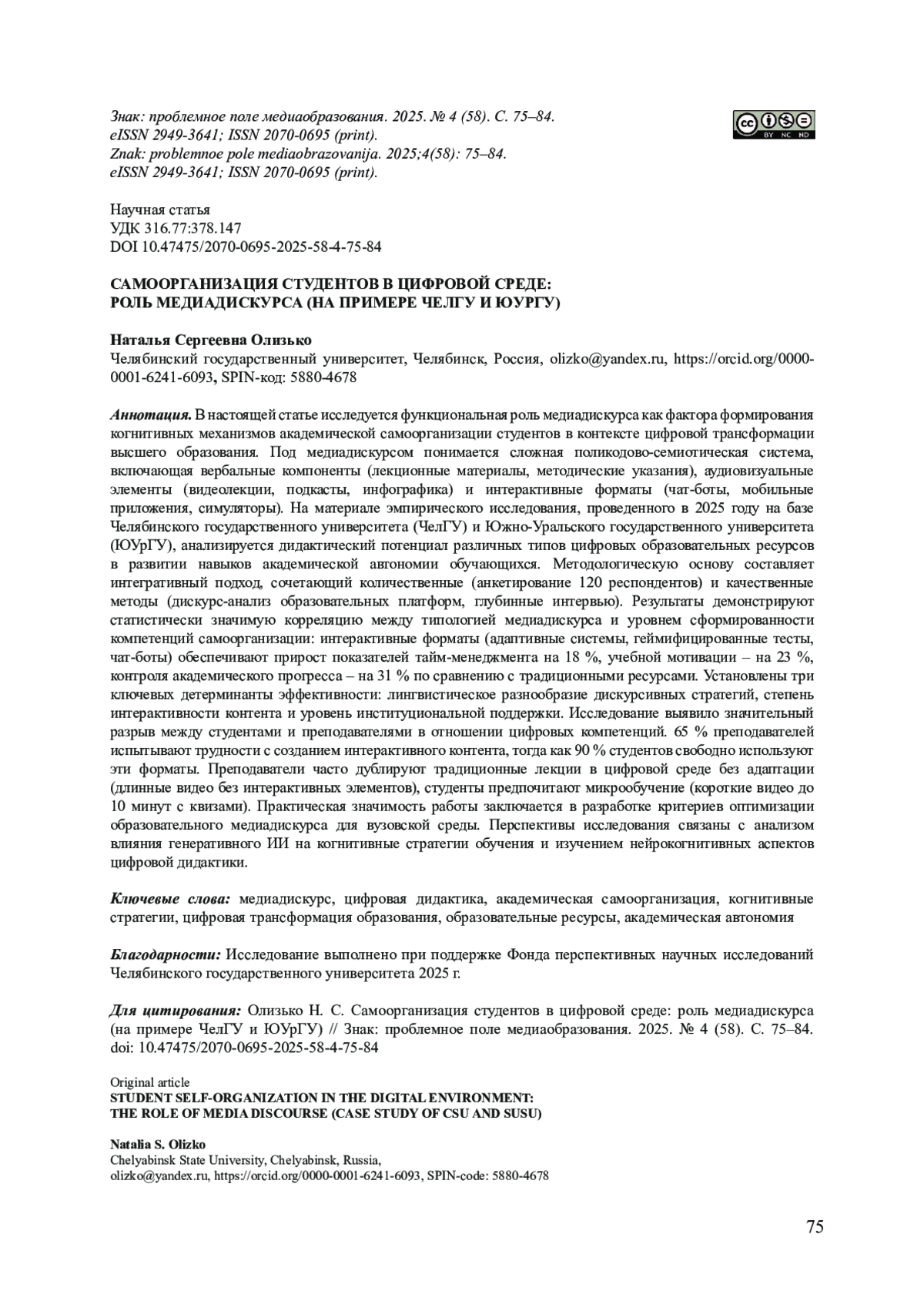 В настоящей статье исследуется функциональная роль медиадискурса как фактора формирования когнитивных механизмов академической самоорганизации студентов в контексте цифровой трансформации высшего образования. Под медиадискурсом понимается сложная поликодово-семиотическая система, включающая вербальные компоненты (лекционные материалы, методические указания), аудиовизуальные элементы (видеолекции, подкасты, инфографика) и интерактивные форматы (чат-боты, мобильные приложения, симуляторы). На материале эмпирического исследования, проведенного в 2025 году на базе Челябинского государственного университета (ЧелГУ) и Южно-Уральского государственного университета (ЮУрГУ), анализируется дидактический потенциал различных типов цифровых образовательных ресурсов в развитии навыков академической автономии обучающихся. Методологическую основу составляет интегративный подход, сочетающий количественные (анкетирование 120 респондентов) и качественные методы (дискурс-анализ образовательных платформ, глубинные интервью). Результаты демонстрируют статистически значимую корреляцию между типологией медиадискурса и уровнем сформированности компетенций самоорганизации: интерактивные форматы (адаптивные системы, геймифицированные тесты, чат-боты) обеспечивают прирост показателей тайм-менеджмента на 18 %, учебной мотивации - на 23 %, контроля академического прогресса - на 31 % по сравнению с традиционными ресурсами. Установлены три ключевых детерминанты эффективности: лингвистическое разнообразие дискурсивных стратегий, степень интерактивности контента и уровень институциональной поддержки. Исследование выявило значительный разрыв между студентами и преподавателями в отношении цифровых компетенций. 65 % преподавателей испытывают трудности с созданием интерактивного контента, тогда как 90 % студентов свободно используют эти форматы. Преподаватели часто дублируют традиционные лекции в цифровой среде без адаптации (длинные видео без интерактивных элементов), студенты предпочитают микрообучение (короткие видео до 10 минут с квизами). Практическая значимость работы заключается в разработке критериев оптимизации образовательного медиадискурса для вузовской среды. Перспективы исследования связаны с анализом влияния генеративного ИИ на когнитивные стратегии обучения и изучением нейрокогнитивных аспектов цифровой дидактики.