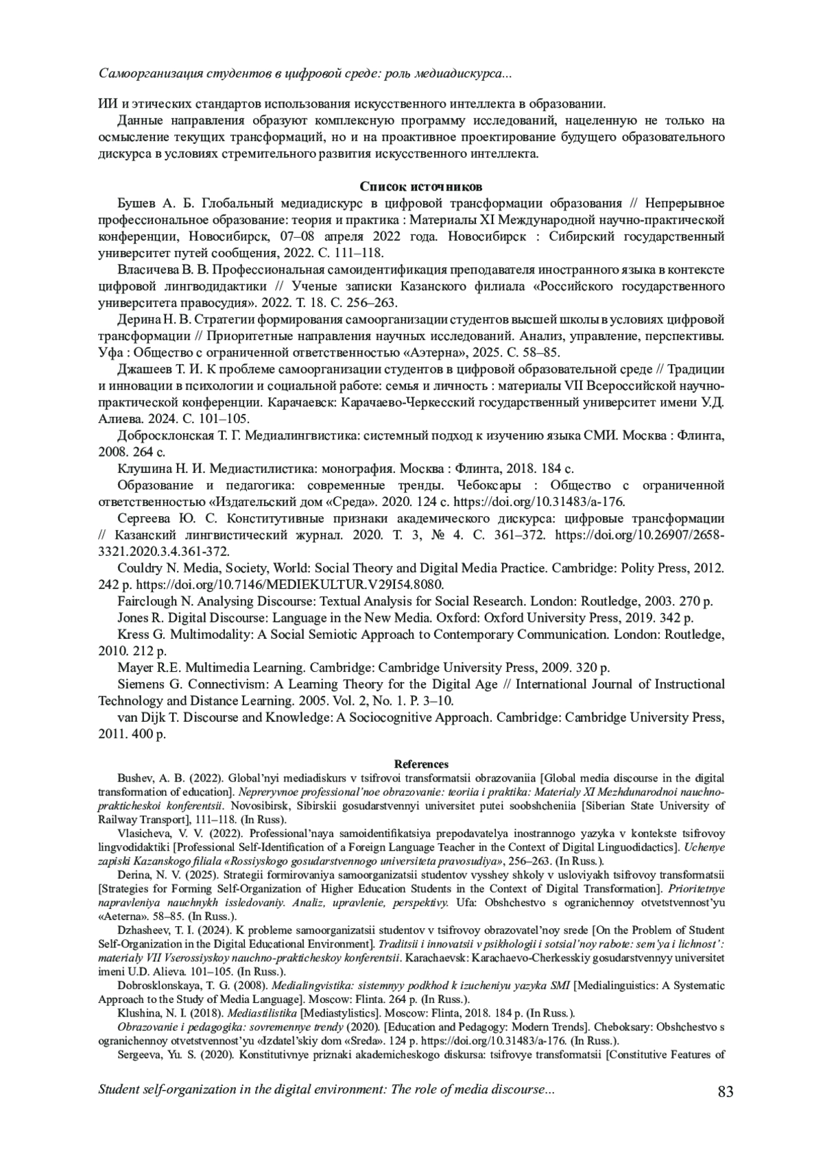 3. Дерина Н. В. Стратегии формирования самоорганизации студентов высшей школы в условиях цифровой трансформации // Приоритетные направления научных исследований. Анализ, управление, перспективы. Уфа: Общество с ограниченной ответственностью “Аэтерна”, 2025. С. 58-85. EDN: GMMGUG