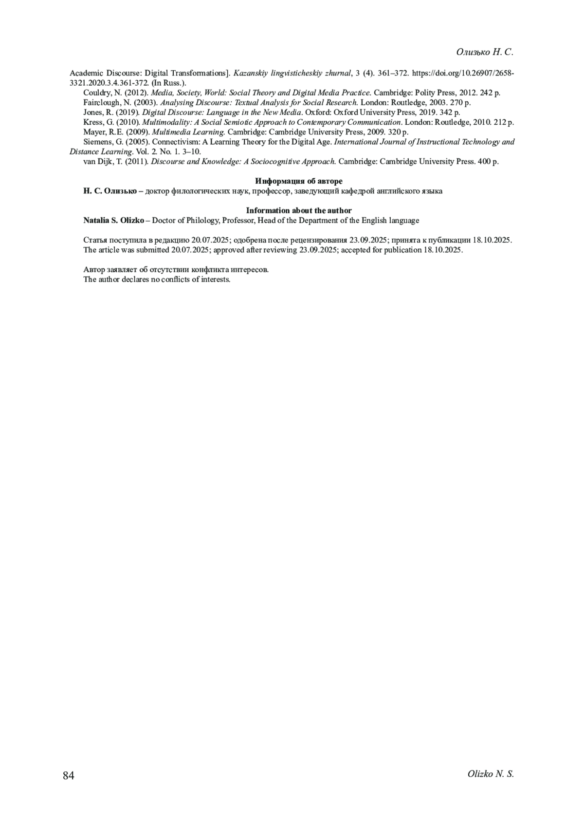 8. Сергеева Ю. С. Конститутивные признаки академического дискурса: цифровые трансформации // Казанский лингвистический журнал. 2020. Т. 3, № 4. С. 361-372. DOI: 10.26907/2658-3321.2020.3.4.361-372 EDN: KPHKBE