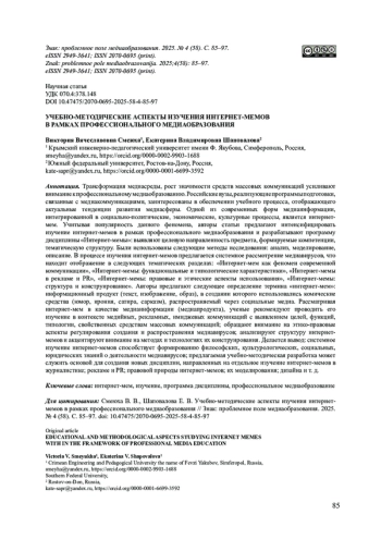 Трансформация медиасреды, рост значимости средств массовых коммуникаций усиливают внимание к профессиональному медиаобразованию. Российские вузы, реализующие программы подготовки, связанные с медиакоммуникациями, заинтересованы в обеспечении учебного процесса, отображающего актуальные тенденции развития медиасферы. Одной из современных форм медиаинформации, интегрированной в социально-политические, экономические, культурные процессы, является интернет-мем. Учитывая популярность данного феномена, авторы статьи предлагают интенсифицировать изучение интернет-мемов в рамках профессионального медиаобразования и разрабатывают программу дисциплины «Интернет-мемы»: выявляют целевую направленность предмета, формируемые компетенции, тематическую структуру. Были использованы следующие методы исследования: анализ, моделирование, описание. В процессе изучения интернет-мемов предлагается системное рассмотрение медиавирусов, что находит отображение в следующих тематических разделах: «Интернет-мем как феномен современной коммуникации», «Интернет-мемы: функциональные и типологические характеристики», «Интернет-мемы в рекламе и PR», «Интернет-мемы: правовые и этические аспекты использования», «Интернет-мемы: структура и конструирование». Авторы предлагают следующее определение термина «интернет-мем»: информационный продукт (текст, изображение, образ), в создании которого использовались комические средства (юмор, ирония, сатира, сарказм), распространяемый через социальные медиа. Рассматривая интернет-мем в качестве медиаинформации (медиапродукта), ученые рекомендуют проводить его изучение в контексте медийных, рекламных, имиджевых коммуникаций с выявлением целей, функций, типологии, свойственных средствам массовых коммуникаций; обращают внимание на этико-правовые аспекты регулирования создания и распространения медиавирусов; анализируют структуру интернет-мемов и акцентируют внимание на методах и технологиях их конструирования. Делается вывод: системное изучение интернет-мемов способствует формированию философских, культурологических, социальных, юридических знаний о деятельности медиавирусов; предлагаемая учебно-методическая разработка может служить основой для создания новых дисциплин, направленных на отдельное изучение интернет-мемов в журналистике; рекламе и PR; правовой природы интернет-мемов; их моделирования; дизайна и т. д.