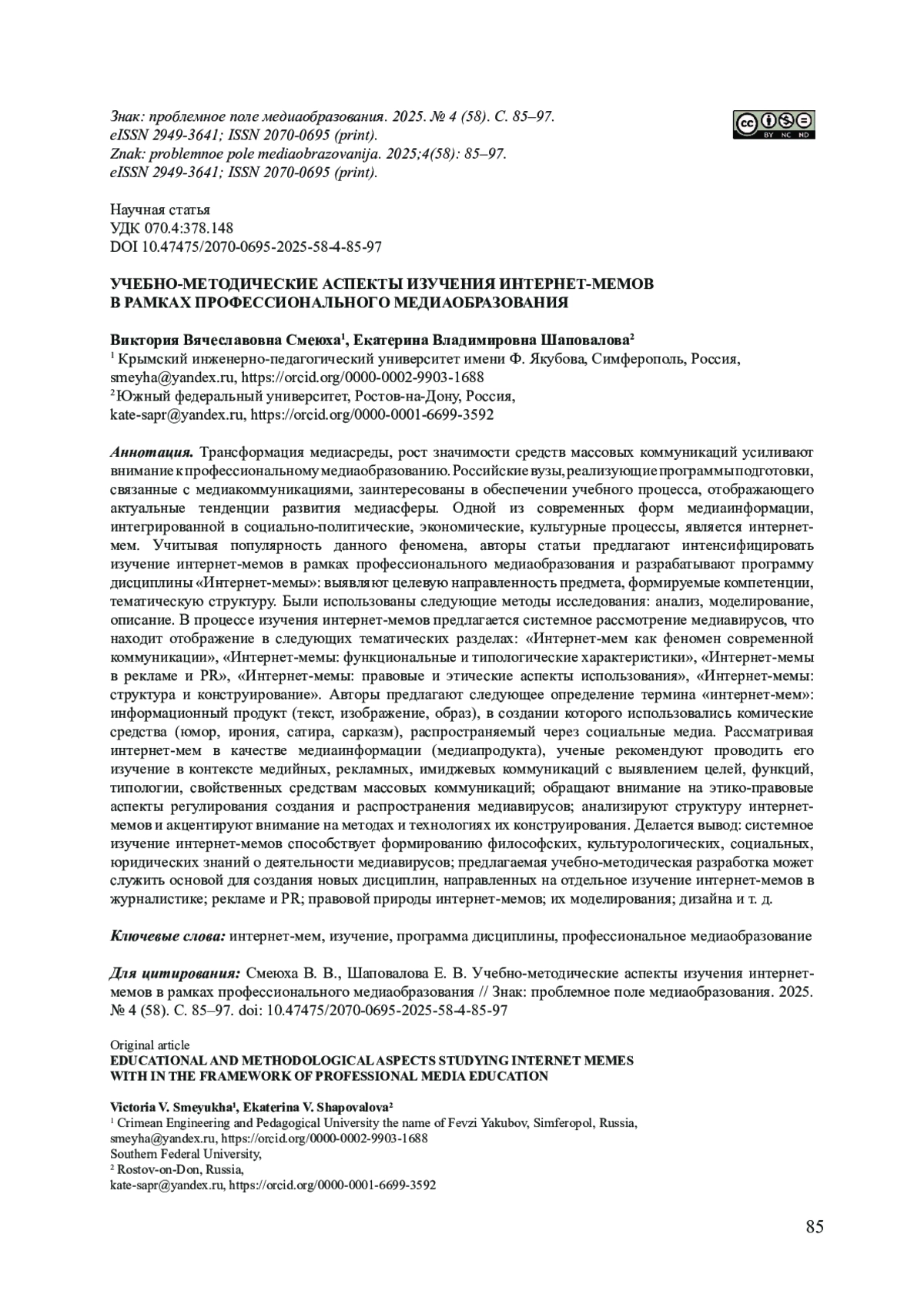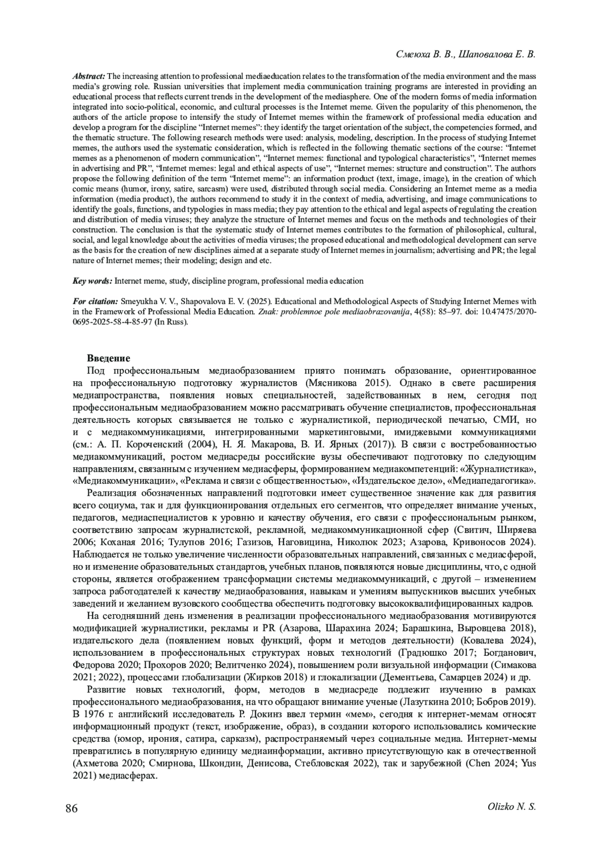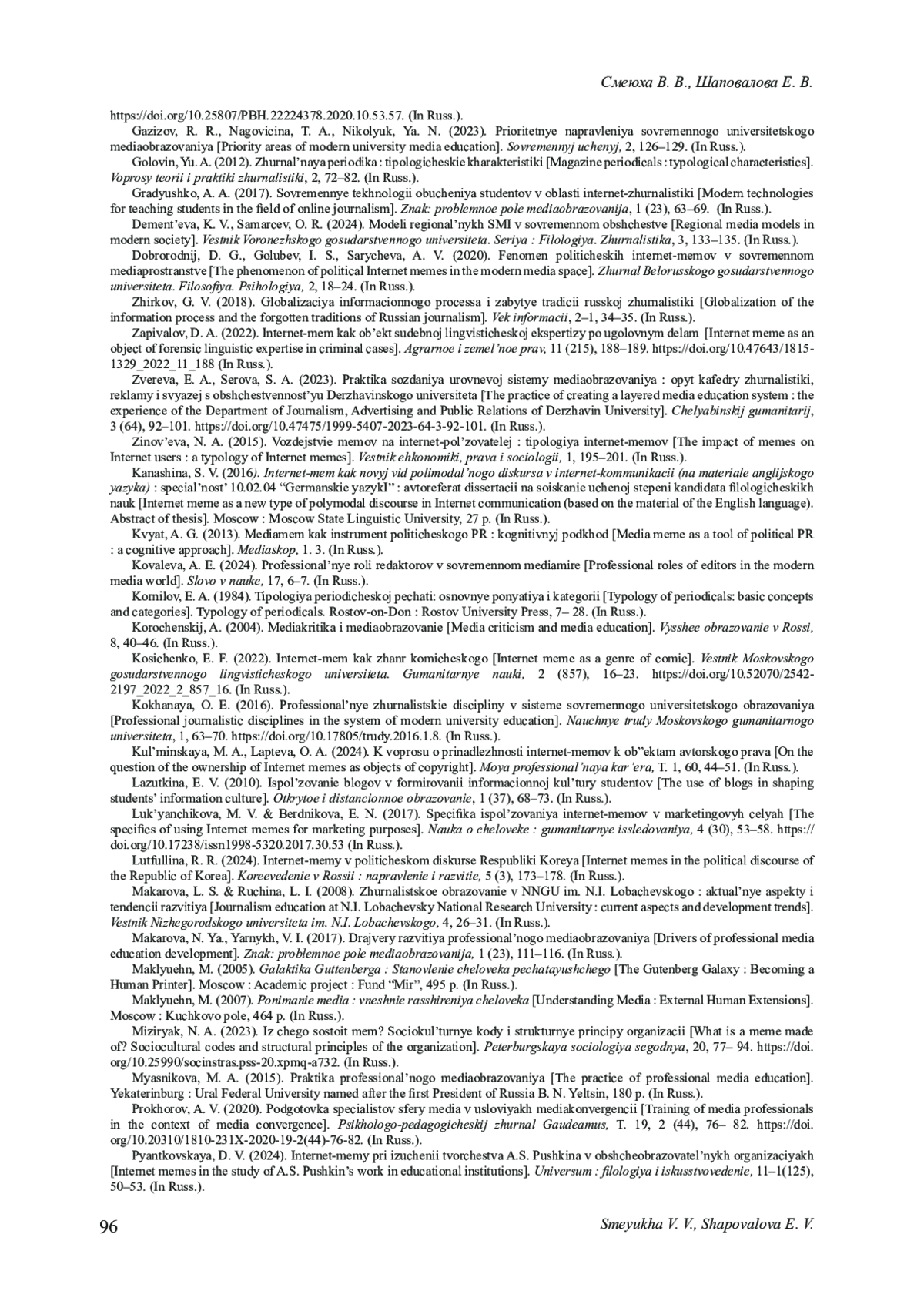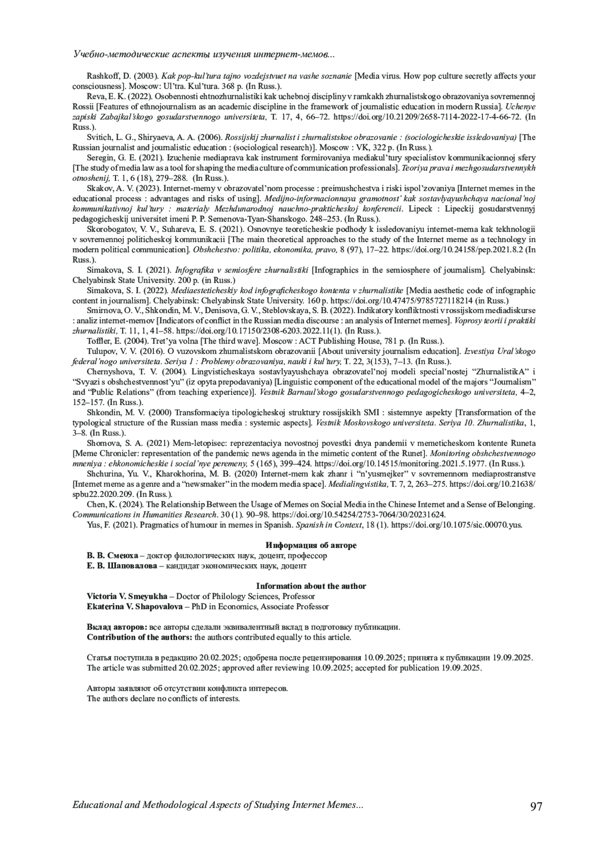51. Смирнова О. В., Шкондин М. В., Денисова Г. В., Стебловская С. Б. Индикаторы конфликтности в российском медиадискурсе: анализ интернет-мемов // Вопросы теории и практики журналистики. 2022. Т. 11, № 1. С. 41-58. DOI: 10.17150/2308-6203.2022.11(1) EDN: PNKALB