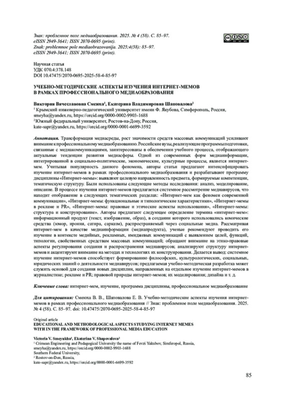47. Скаков А. В. Интернет-мемы в образовательном процессе: преимущества и риски использования // Медийно-информационная грамотность как составляющая национальной коммуникативной культуры: материалы Международной научно-практической конференции. Липецк: Липецкий государственный педагогический университет имени П. П. Семенова-Тян-Шанского, 2023. С. 248-253. EDN: KKISKK