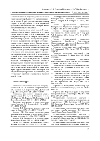 23. Функционально-семантические категории в якутском языке: грамматическая и лексическая база / отв. ред. В.Д. Монастырёв. Якутск: ИГИиПМНС СО РАН, 2017. 162 с. EDN: YLGUJZ
