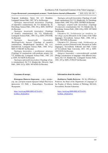 24. Функционально-семантические категории в якутском языке: взаимодействие лексики и грамматики / отв. ред. Н.И. Данилова. Новосибирск: СО РАН, 2024. 184 с. EDN: BGGTHJ