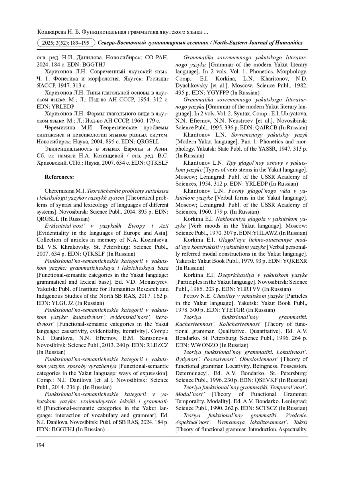 6. Коркина Е.И. Деепричастия в якутском языке. Новосибирск: Наука, 1985. 203 с. EDN: YHRTVV
