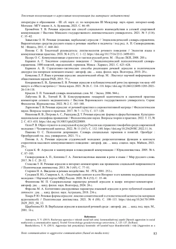 7. Глущенко О. А., Гришанин Н. В., Кириллина Н. В. Экология коммуникации: факторы токсичности в медийных текстах // Коммуникология. 2021. Т. 9, № 4. С. 160-178. DOI: 10.21453/2311-3065-2021-9-4-160-178 EDN: EIPXEV