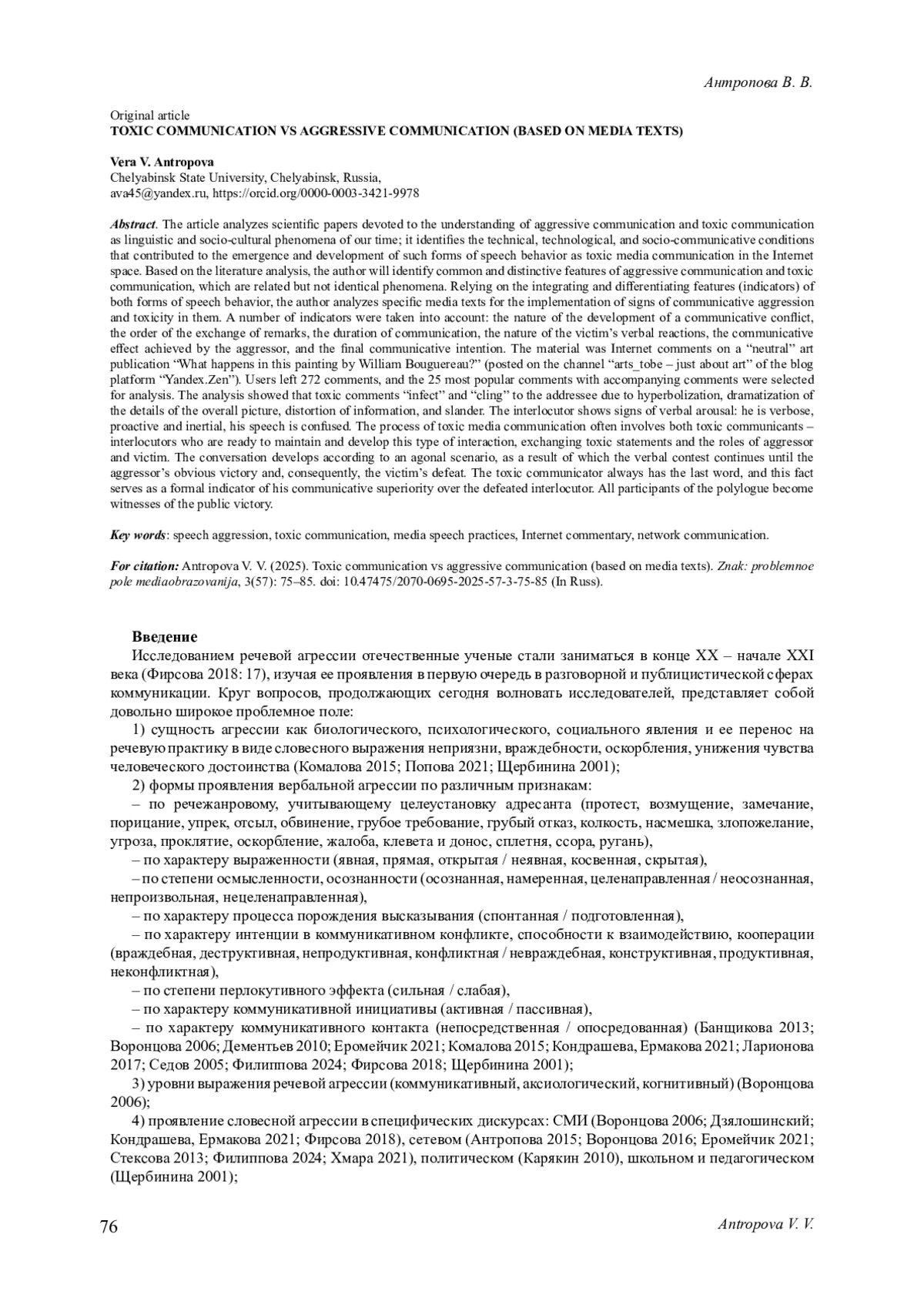 В статье осуществляется анализ научных работ, посвященных осмыслению агрессивной коммуникации и токсичной коммуникации как лингвистических и социокультурных явлений современности, определяются технические, технологические, социальнокоммуникативные условия, способствовавшие появлению и развитию в интернет-пространстве такой формы речевого поведения, как токсичная медиакоммуникация. На основе проведенного анализа литературы автор определят общие и различительные черты агрессивного общения и токсичного общения - явлений смежных, но не тождественных. Полагаясь на интегрирующие и дифференцирующие черты (показатели) обеих форм речевого поведения, автор анализирует конкретные медийные тексты на предмет реализации в них признаков коммуникативной агрессивности и токсичности. Учитывался ряд показателей: характер развития коммуникативного конфликта, очередность обмена репликами, продолжительность коммуникации, характер вербальных реакций жертвы, достигнутый агрессором коммуникативный эффект, конечная коммуникативная интенция. Материалом послужили интернет-комментарии к «нейтральной» публикации на тему искусства «Что происходит на этой картине Вильяма Бугро?», размещенной на канале «arts_tobe - просто об искусстве» блог-платформы «Яндекс. Дзен». Пользователи оставили 272 комментария, для анализа были отобраны 25 наиболее популярных комментариев с сопутствующими комментариями. Анализ показал, что токсичные комментарии «заражают», «цепляют» адресата вследствие гиперболизации, драматизации адресантом деталей общей картины, искажения информации, клеветы. Собеседник демонстрирует признаки речевого возбуждения: он многословен, инициативен и инерционен, его речь сбивчива. В процесс токсичного медийного общения часто вовлекаются оба токсичных коммуниканта - собеседники, готовые поддерживать и развивать подобный тип взаимодействия, обмениваясь токсичными высказываниями и ролями агрессора и жертвы. Беседа развивается по агональному сценарию, в результате которого словесное состязание продолжается до очевидной победы агрессора и, соответственно, поражения жертвы. За токсичным коммуникатором всегда остается последнее слово, и этот факт служит формальным показателем его коммуникативного превосходства над поверженным собеседником. Свидетелями публичной победы становятся все участники полилога.