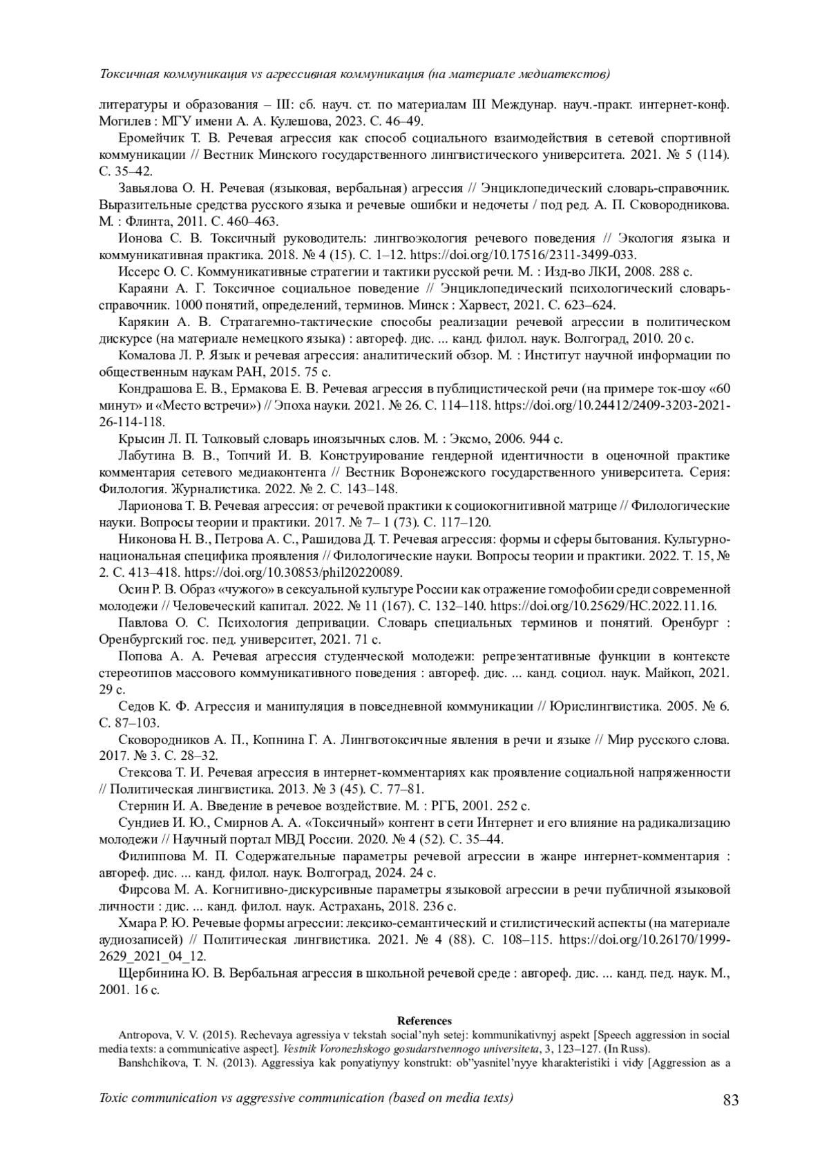 11. Еромейчик Т. В. Речевая агрессия как способ социального взаимодействия в сетевой спортивной коммуникации // Вестник Минского государственного лингвистического университета. 2021. № 5 (114). С. 35-42.