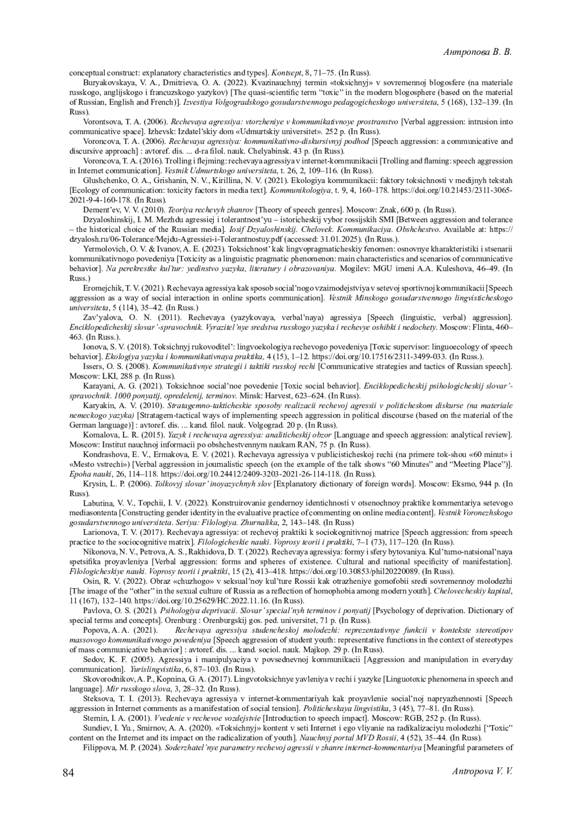 1. Антропова В. В. Речевая агрессия в текстах социальных сетей: коммуникативный аспект // Вестник Воронежского государственного университета. 2015. № 3. С. 123-127.