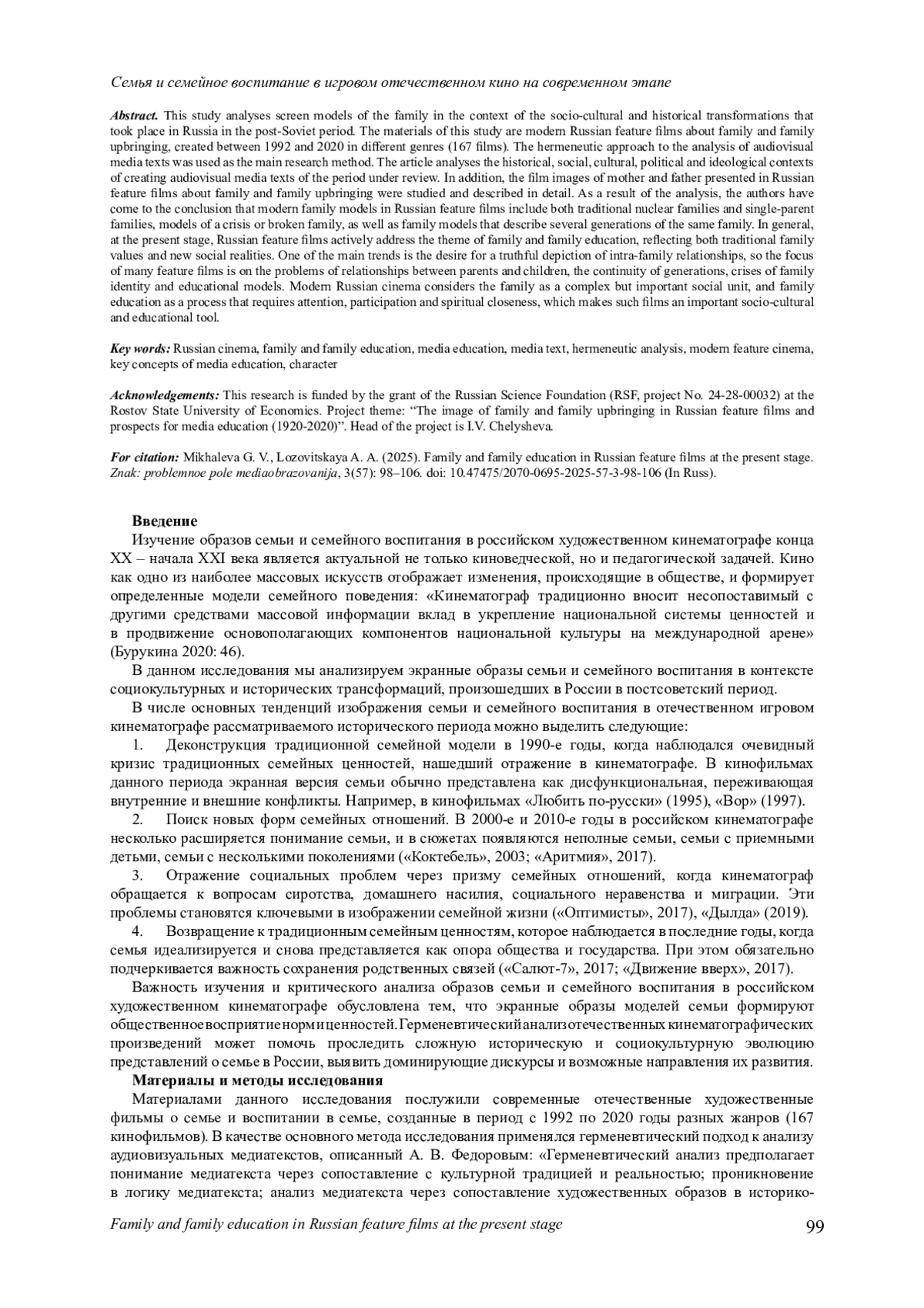 В данном исследования анализируются экранные модели семьи в контексте социокультурных и исторических трансформаций, произошедших в России в постсоветский период. Материалами данного исследования послужили современные отечественные художественные фильмы о семье и воспитании в семье, созданные в период с 1992 по 2020 годы разных жанров (167 кинофильмов). В качестве основного метода исследования применялся герменевтический подход к анализу аудиовизуальных медиатекстов. В статье осуществлен анализ исторического, социального, культурного, политического и идеологического контекстов создания аудиовизуальных медиатекстов рассматриваемого периода. Кроме того, подробно изучены и описаны кинообразы матери и отца, представленные в отечественном игровом кино о семье и семейном воспитании. В результате анализа авторы пришли к выводу о том, что современные модели семьи в отечественном игровом кинематографе включают как традиционные нуклеарные семьи, так и неполные семьи, модели кризисной или разрушенной семьи, а также модели семьи, в которых описываются несколько поколений одной семьи. В целом на современном этапе отечественное игровой кинематограф активно обращается к теме семьи и семейного воспитания, отражая как традиционные семейные ценности, так и новые социальные реалии. Одной из основных тенденций является стремление к правдивому изображению внутрисемейных отношений, поэтому в центре внимания многих художественных фильмов оказываются проблемы взаимоотношений между родителями и детьми, преемственности поколений, кризисов семейной идентичности и воспитательных моделей. Современный отечественный кинематограф рассматривает семью как сложную, но важную социальную единицу, а семейное воспитание как процесс, требующий внимания, участия и духовной близости, что делает такие фильмы важным социокультурным и воспитательным инструментом.