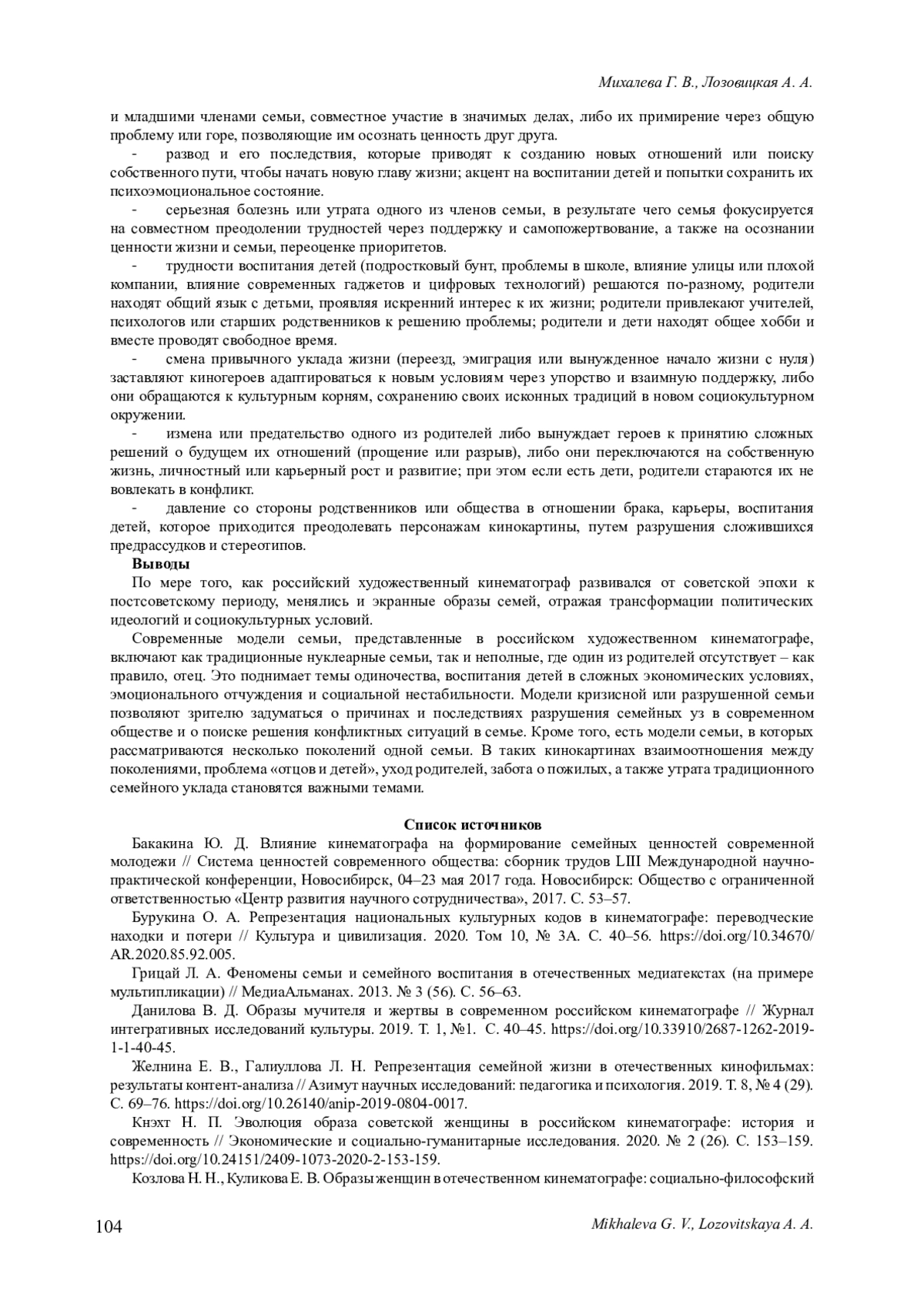 7. Козлова Н. Н., Куликова Е. В. Образы женщин в отечественном кинематографе: социально-философский анализ // Вестник Тверского государственного университета. Серия: Философия. 2023. № 3 (65). С. 48-56. DOI: 10.26456/vtphilos/2023.3.048 EDN: GNJZBO