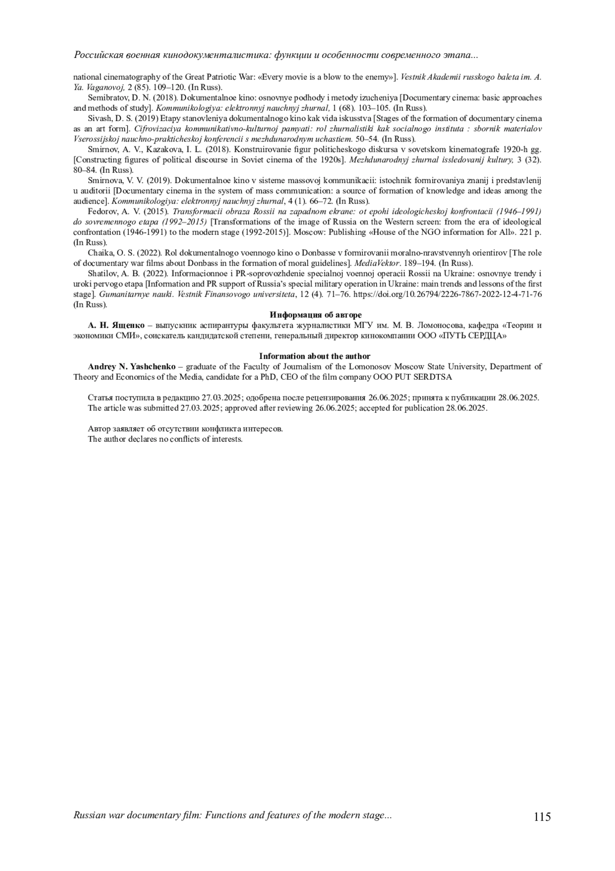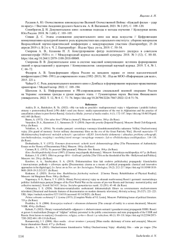 24. Чайка О. С. Роль документального военного кино о Донбассе в формировании морально-нравственных ориентиров // МедиаVектор. 2022. С. 189-194. EDN: OFTDTV