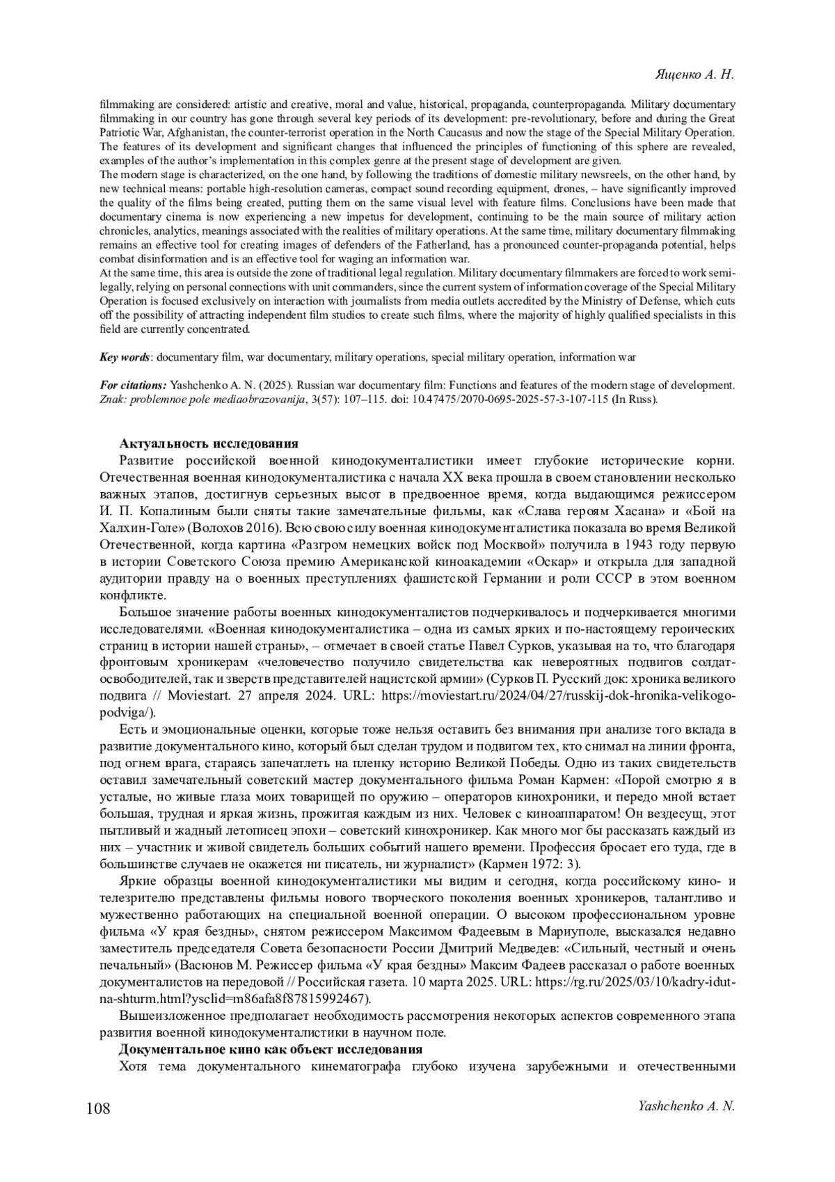 В статье исследуются исторические и современные аспекты функционирования отечественной военной кинодокументалистики, имеющей большие творческие и культурные традиции. На значительной теоретической и эмпирической базе рассмотреныфункциивоеннойкинодокументалистики: художественно-творческая, морально-ценностная, историческая, пропагандистская, контрпропагандистская. Военная кинодокументалистика в нашей стране прошла несколько ключевых этапов своего развития: предреволюционный, период до и во время Великой Отечественной, афганский, контртеррористической операции на Северном Кавказе и теперь этап специальной военной операции. Выявлены особенности развития и существенные изменения, повлиявшие на принципы функционирования этой сферы, приводятся примеры авторской реализации этого вида кинематографа на современном этапе развития. Современный этап характеризуется, с одной стороны, тем, что военные кинодокументалисты следуют традициям отечественной военной кинохроники, с другой, - значительным повышением качества создаваемых картин, связанному с эволюцией технических средств: появлением портативных камер высокого разрешения, компактного звукозаписывающего оборудования, дронов для воздушной съемки. По визуальному уровню документальные фильмы становятся в один ряд с игровыми. Документальное кино переживает новый импульс развития, продолжая быть основным источником хроники, аналитики, смыслов, связанных с реалиями боевых действий. При этом военная кинодокументалистика остается эффективным инструментом создания образов защитников отечества, имеет выраженный контрпропагандистский потенциал, способствует борьбе с дезинформацией и является эффективным инструментом ведения информационных войн. Вместе с тем данная сфера находится вне зоны традиционного правового регулирования. Военные кинодокументалисты вынуждены работать полулегально, опираясь на личные связи с командирами подразделений, так как текущая система информационного освещения специальной военной операции заточена исключительно на взаимодействие с журналистами, аккредитованных при Министерстве обороны средств массовой информации, что отсекает возможность привлекать для создания таких фильмов независимые киностудии, где сконцентрировано большинство высококвалифицированных специалистов данной области.