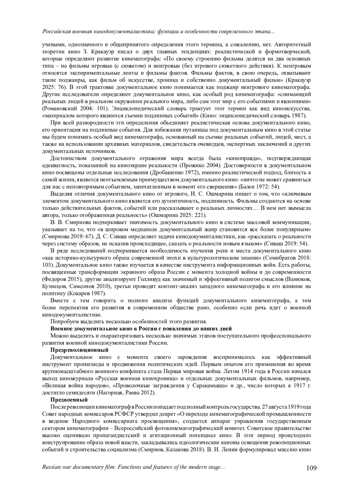 22. Смирнова В. В. Документальное кино в системе массовой коммуникации: источник формирования знаний и представлений у аудитории // Коммуникология: электронный научный журнал. 2019. Т. 4, № 1. С. 66-72. EDN: OVFPOJ