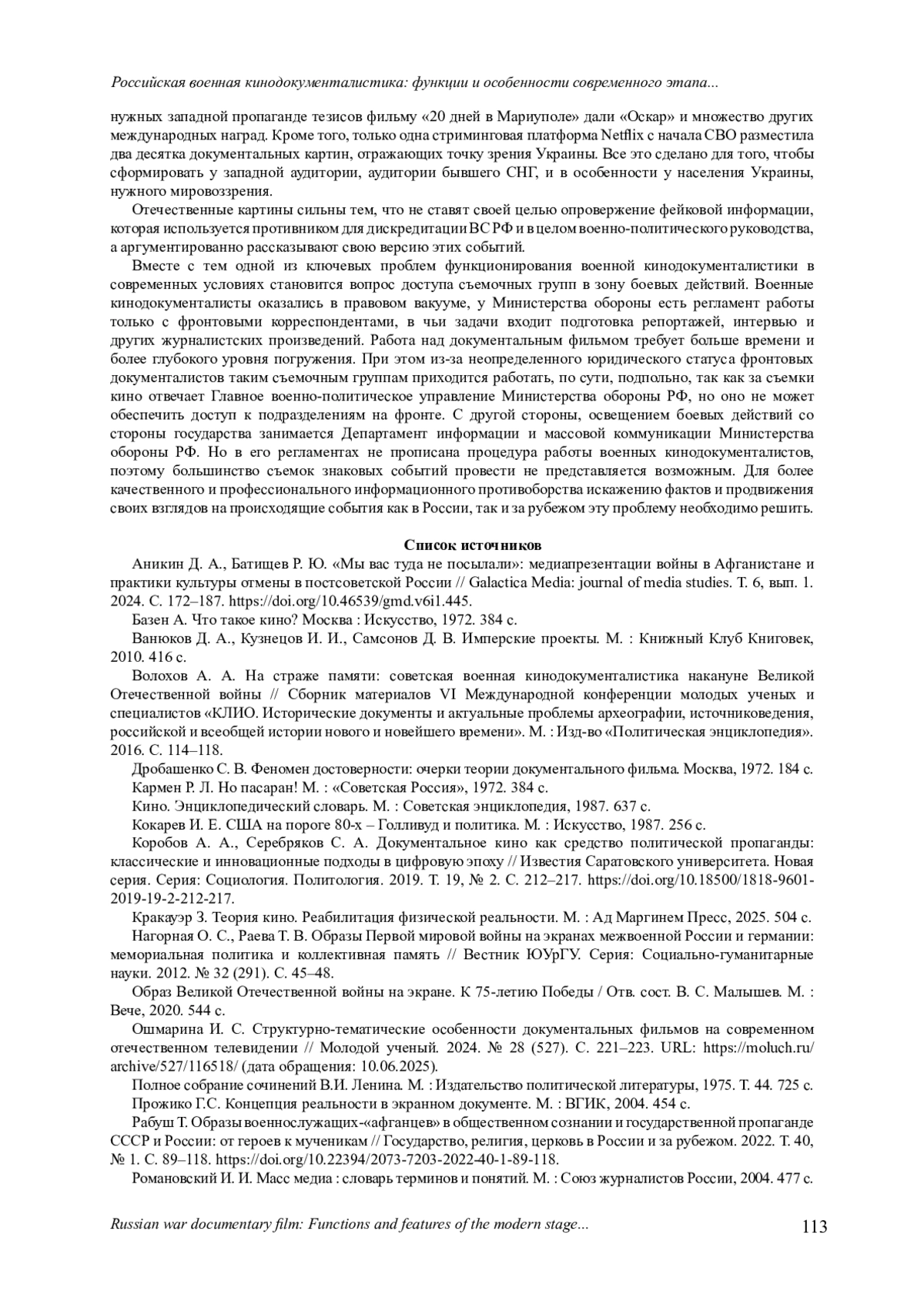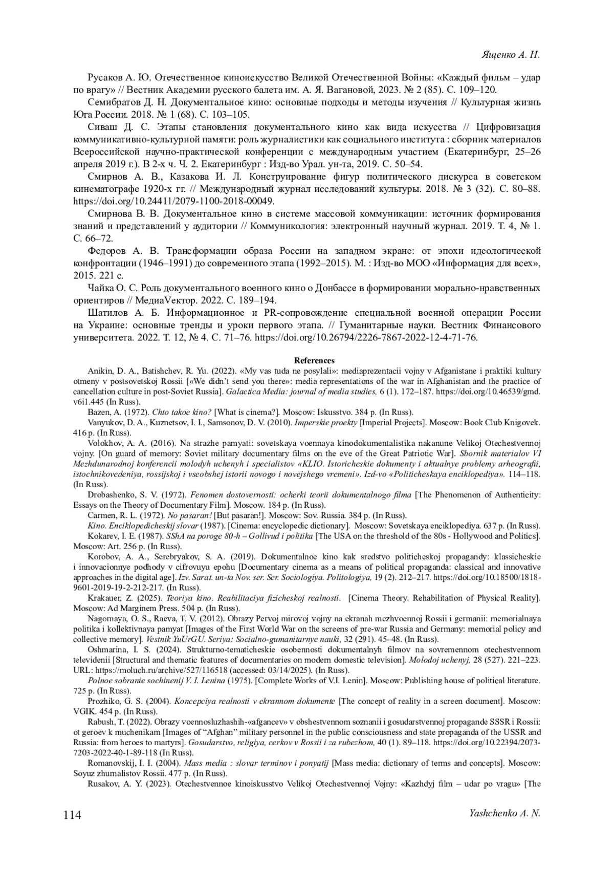 1. Аникин Д. А., Батищев Р. Ю. “Мы вас туда не посылали”: медиапрезентации войны в Афганистане и практики культуры отмены в постсоветской России // Galactica Media: journal of media studies. Т. 6, вып. 1. 2024. С. 172-187. DOI: 10.46539/gmd.v6i1.445 EDN: ZSYIDN