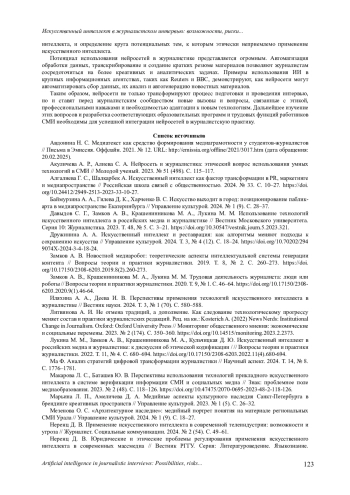 11. Лукина М. М., Замков А. В., Крашенинникова М. А., Кульчицкая Д. Ю. Искусственный интеллект в российских медиа и журналистике: к дискуссии об этической кодификации /// Вопросы теории и практики журналистики. 2022. Т. 11, № 4. С. 680-694. DOI: 10.17150/2308-6203.2022.11(4).680-694 EDN: WMNHIF