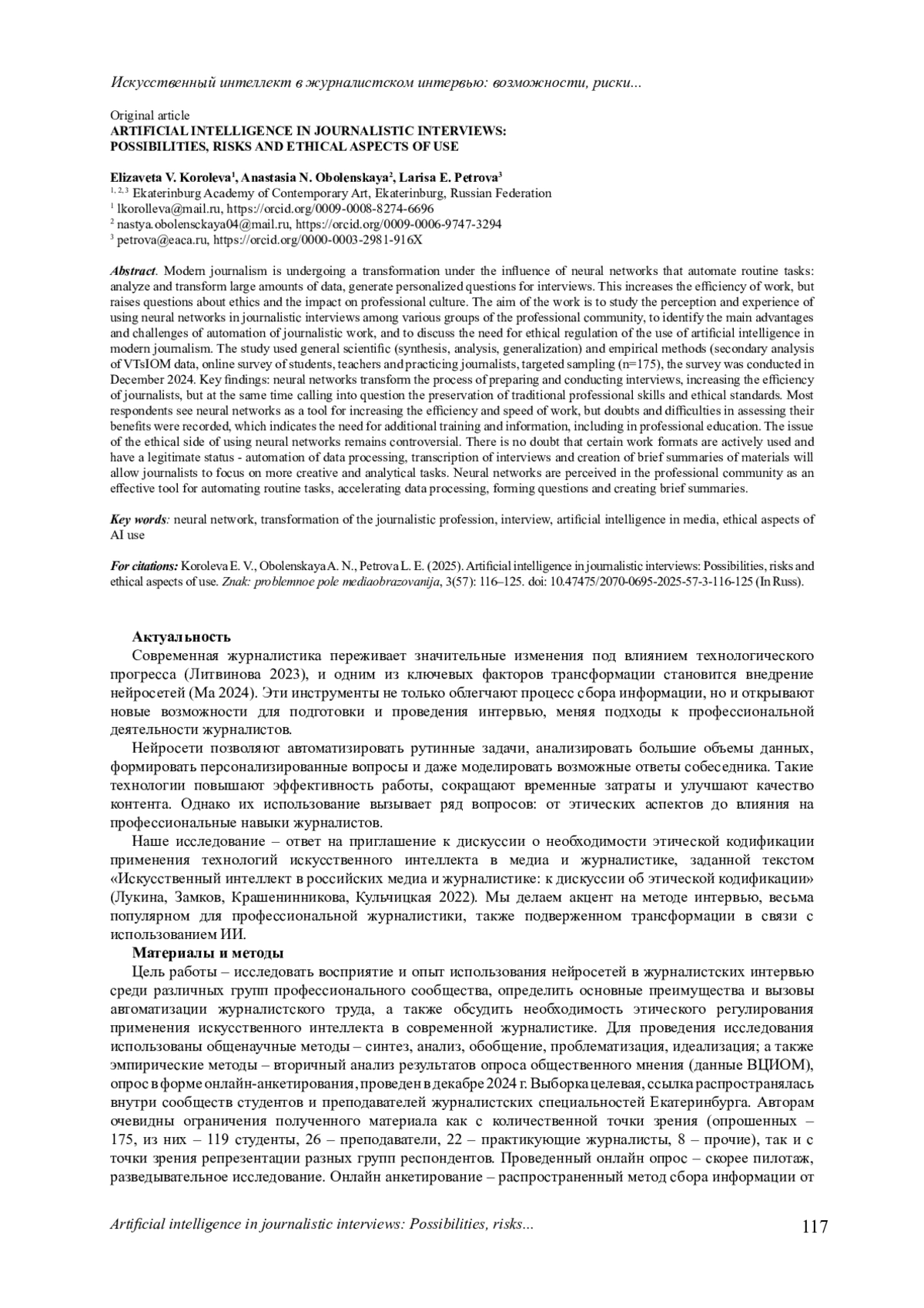 20. Хачикян Е. И., Зорина М. В. Перспективы развития журналистики в эпоху нейросетей // Современный ученый. 2024. № 3. С. 202-207. DOI: 10.58224/2541-8459-2024-3-202-207 EDN: IUOSVU