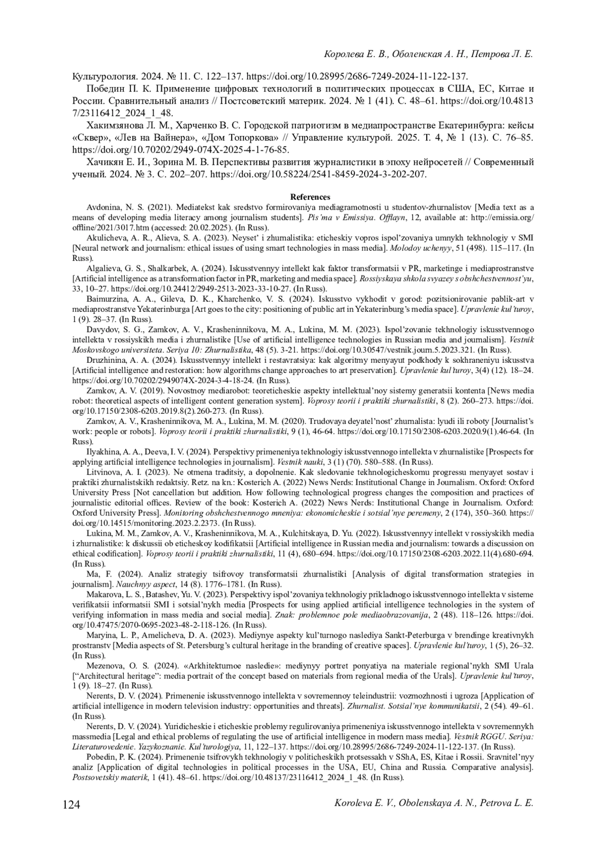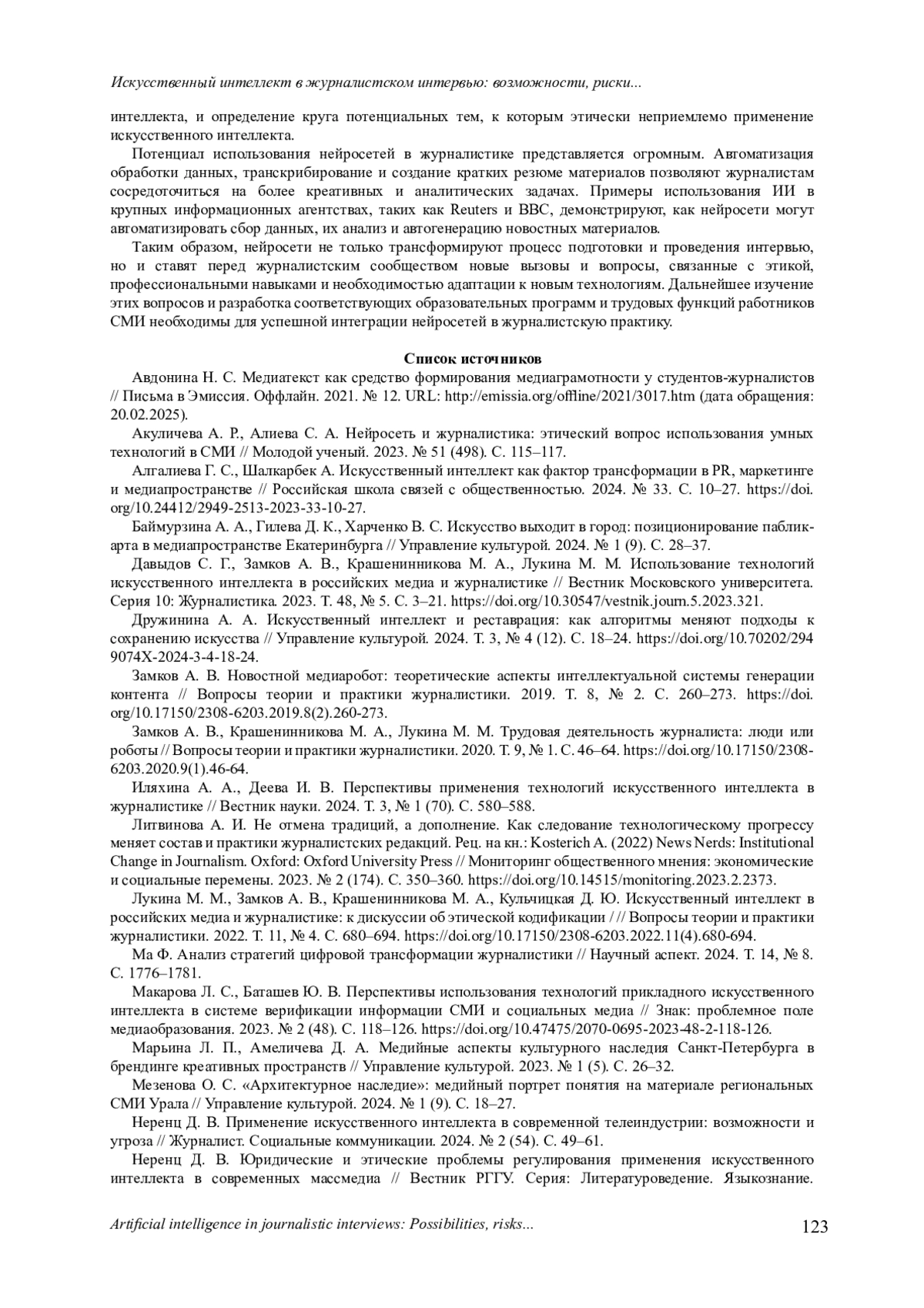 5. Давыдов С. Г., Замков А. В., Крашенинникова М. А., Лукина М. М. Использование технологий искусственного интеллекта в российских медиа и журналистике // Вестник Московского университета. Серия 10: Журналистика. 2023. Т. 48, № 5. С. 3-21. DOI: 10.30547/vestnik.journ.5.2023.321 EDN: ZZJRRX