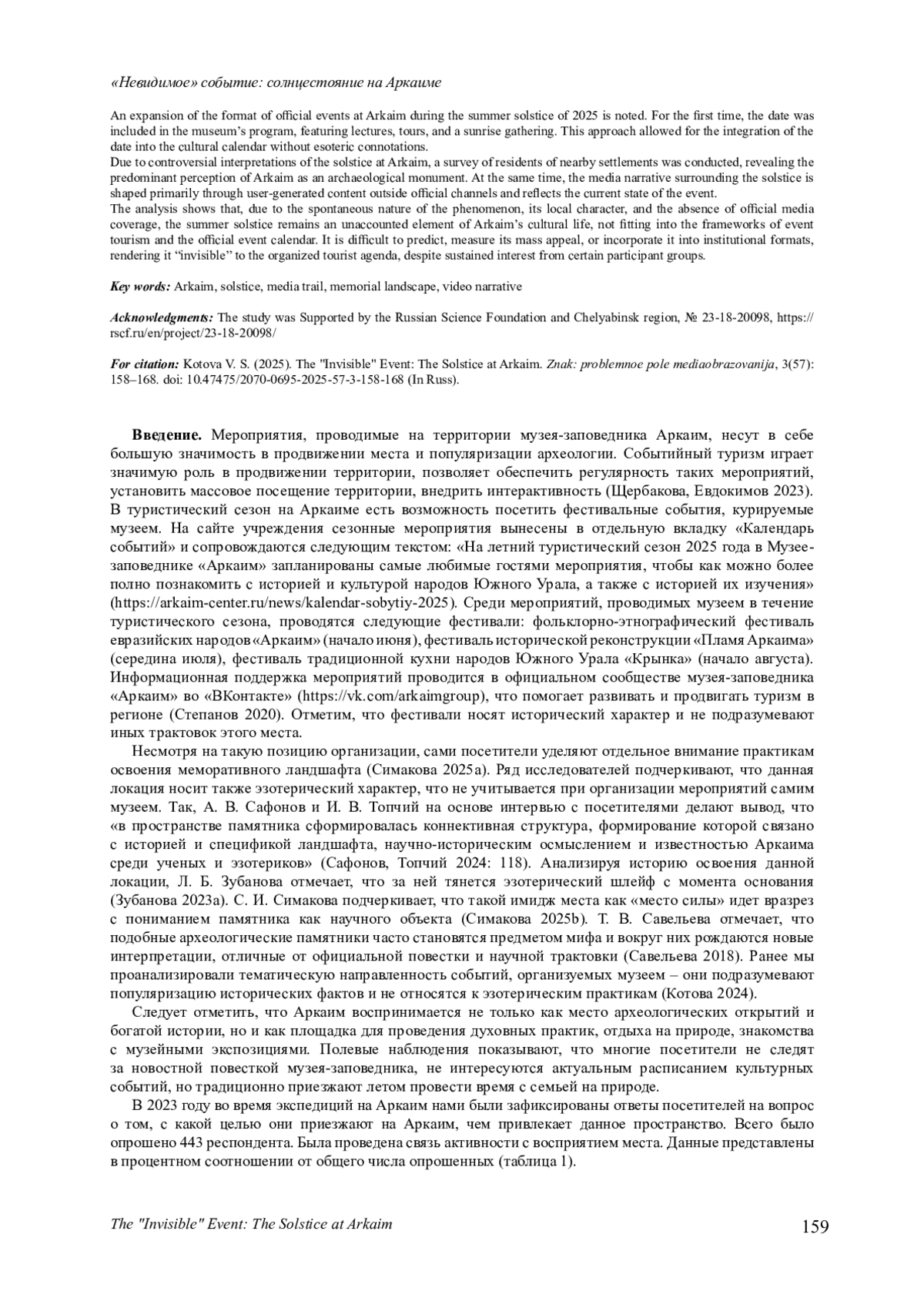 6. Медведева A. P. Медиашлейф солнцестояния в сопоставлении с медиаинформированностью посетителей Аркаима // Знак: проблемное поле медиаобразования. 2023. № 4 (50). C. 89-95. DOI: 10.47475/2070-0695-2023-50-4-89-95 EDN: HXCGAH
