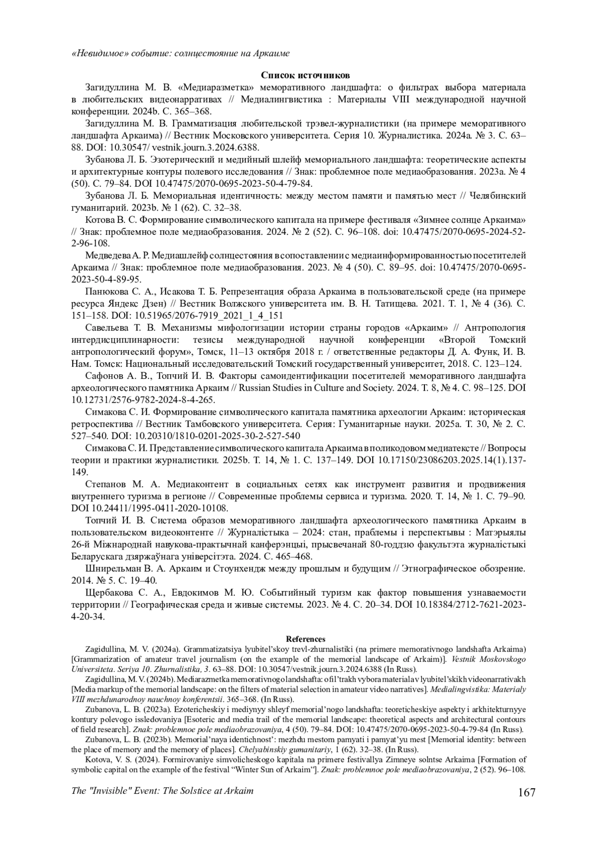 2. Загидуллина М. В. Грамматизация любительской трэвел-журналистики (на примере меморативного ландшафта Аркаима) // Вестник Московского университета. Серия 10. Журналистика. 2024a. № 3. С. 63-88. DOI: 10.30547vestnik.journ.3.2024.6388. EDN: FLWEYI