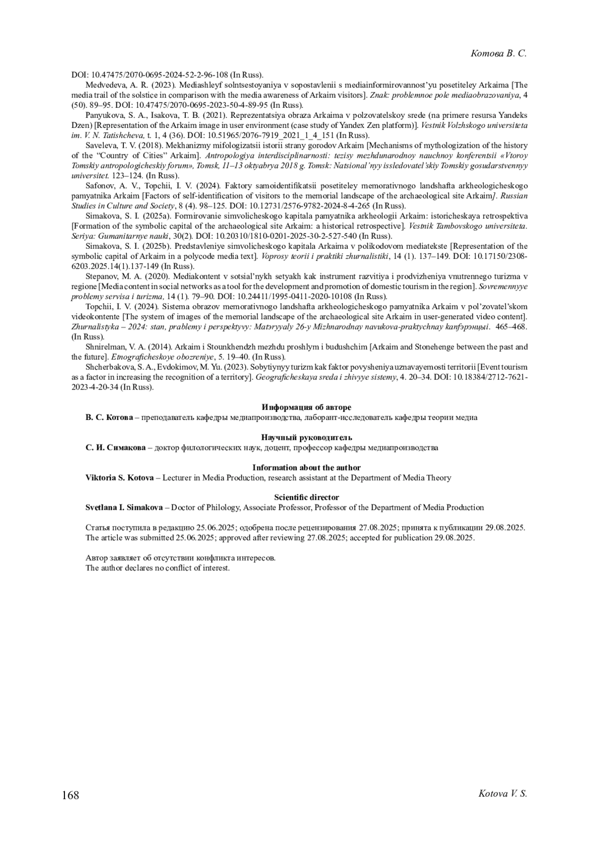 11. Симакова С. И. Представление символического капитала Аркаима в поликодовом медиатексте // Вопросы теории и практики журналистики. 2025b. Т. 14, № 1. С. 137-149. 10.17150/23086203.2025.14(1).137- 149. DOI: 10.17150/23086203.2025.14(1).137-149 EDN: MDCAOM