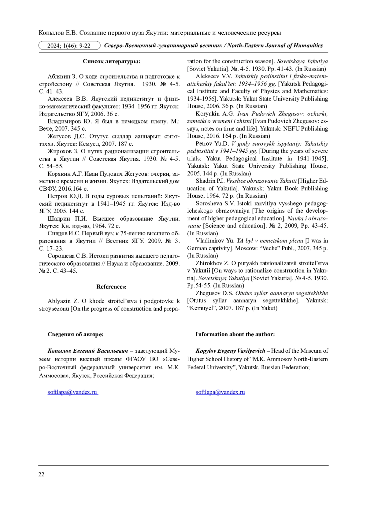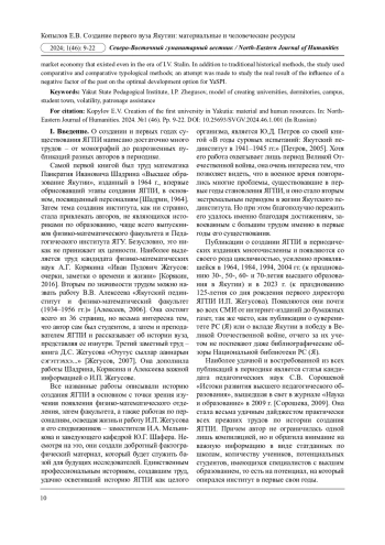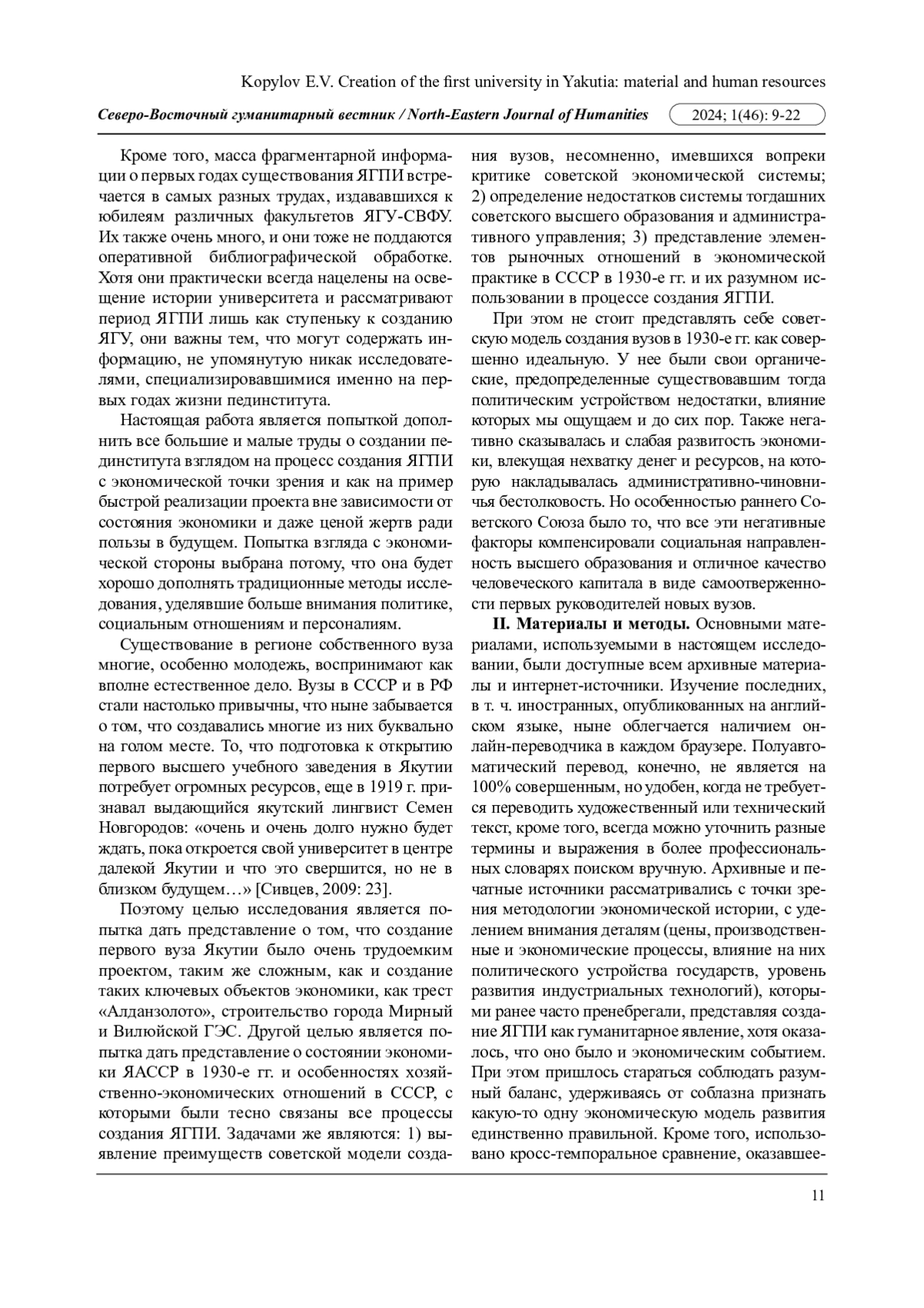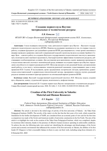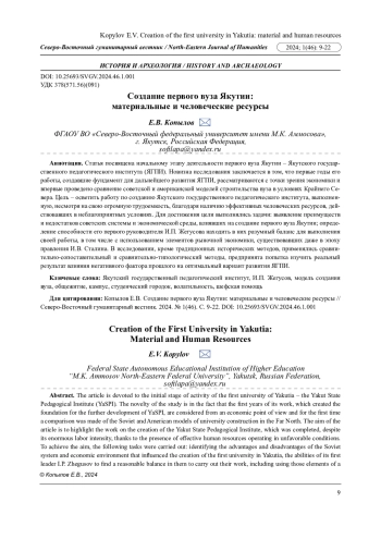 Цель - осветить работу по созданию Якутского государственного педагогического института, выполненную, несмотря на свою огромную трудоемкость, благодаря наличию эффективных человеческих ресурсов, действовавших в неблагоприятных условиях. Для достижения цели выполнялись задачи: выявление преимуществ и недостатков советских системы и экономической среды, влиявших на создание первого вуза Якутии; определение способности его первого руководителя И. П. Жегусова находить в них разумный баланс для выполнения своей работы, в том числе с использованием элементов рыночной экономики, существовавших даже в эпоху правления И. В. Сталина. В исследовании, кроме традиционных исторических методов, применялись сравнительно-сопоставительный и сравнительно-типологический методы, предпринята попытка изучить реальный результат влияния негативного фактора прошлого на оптимальный вариант развития ЯГПИ.