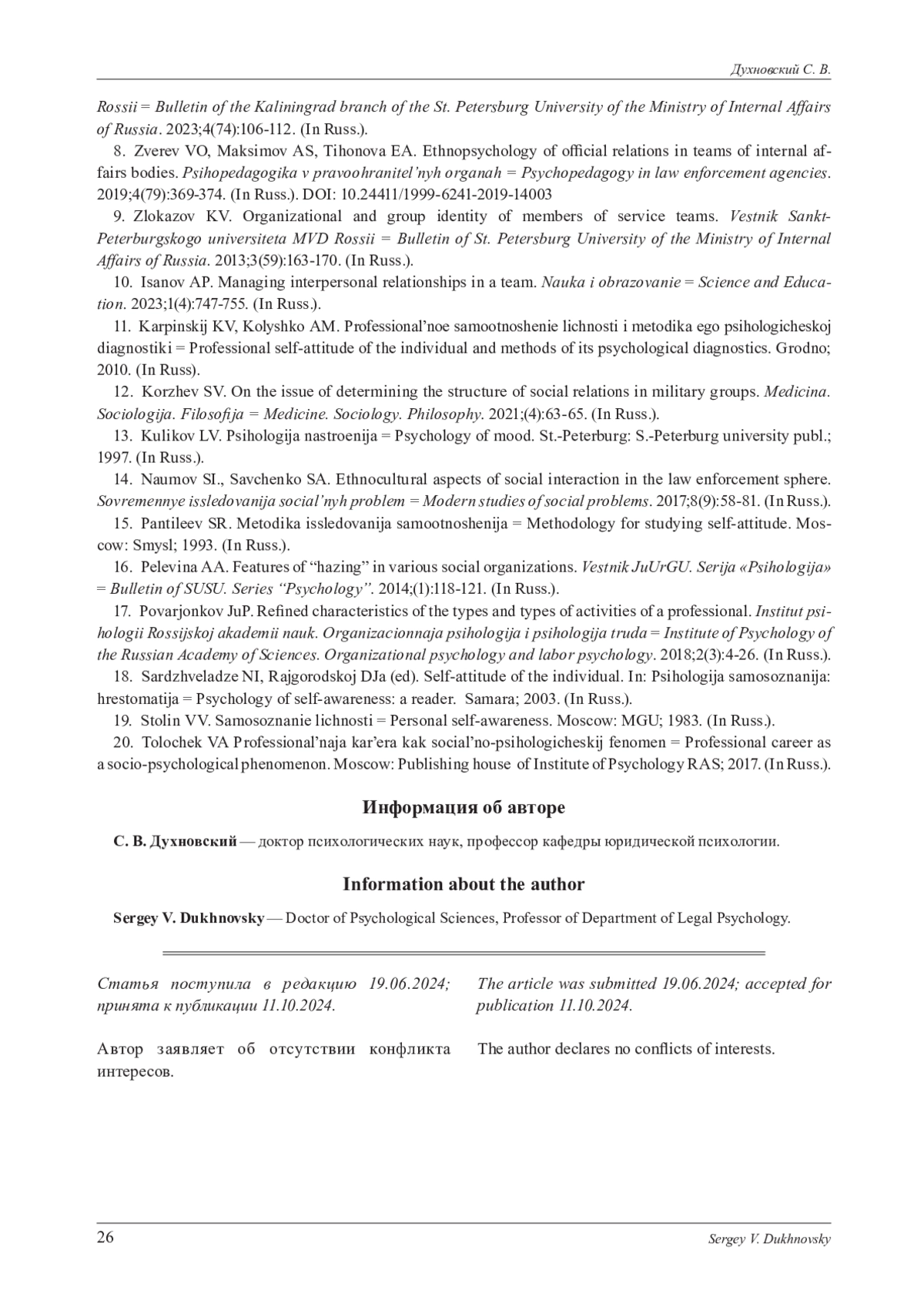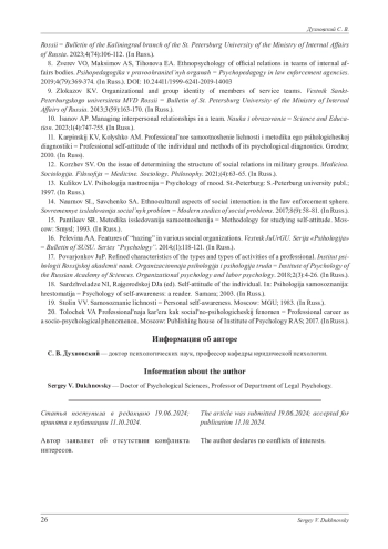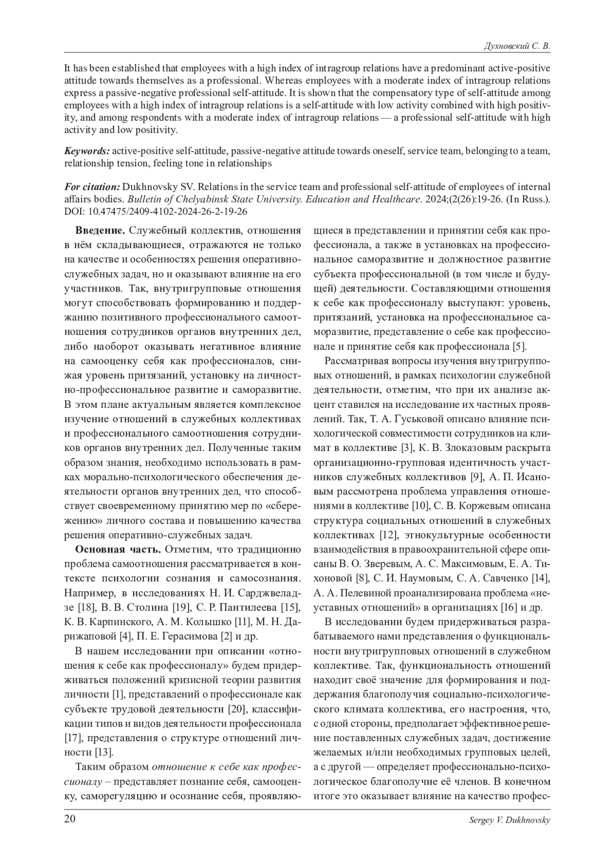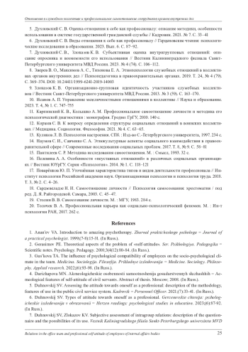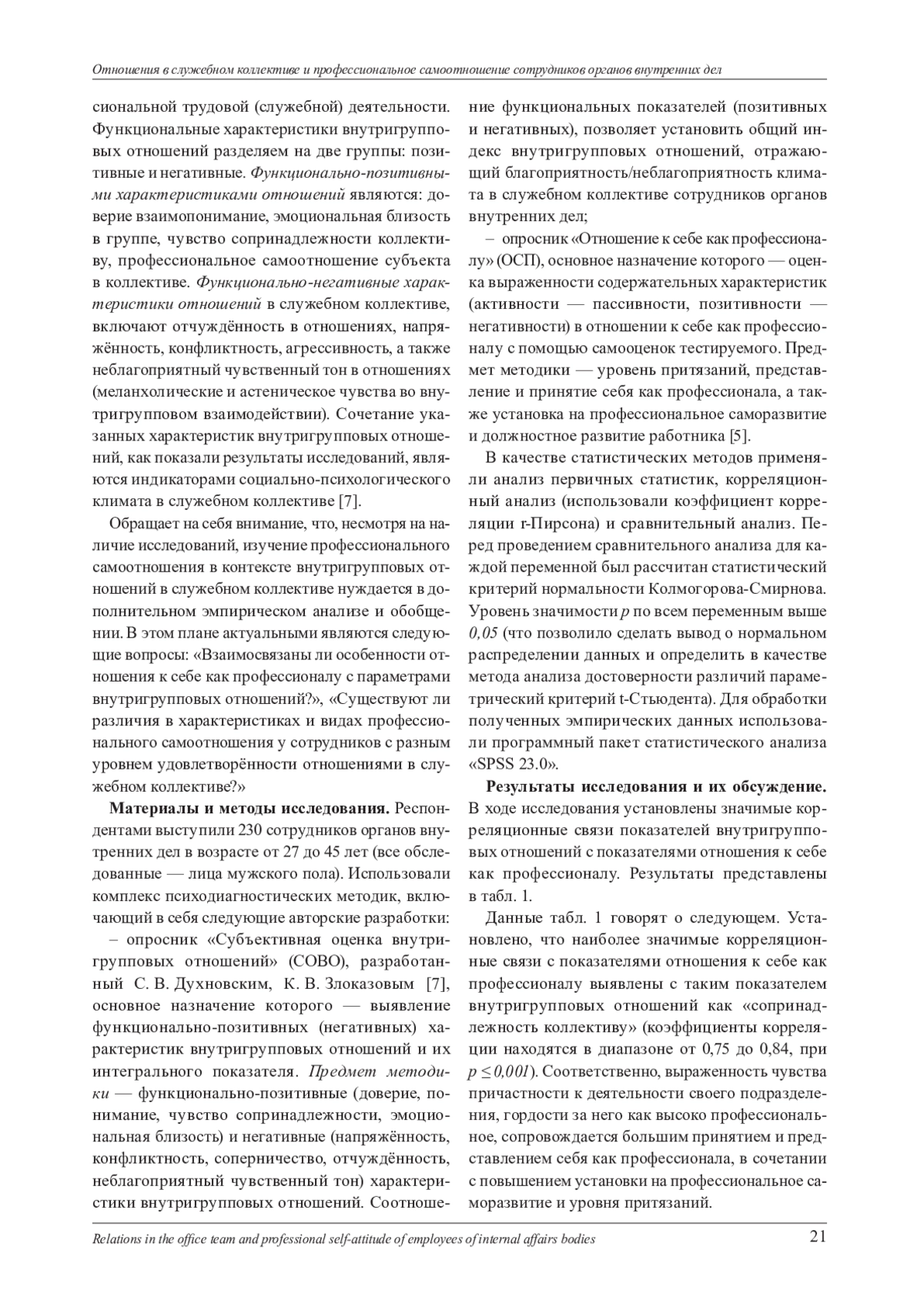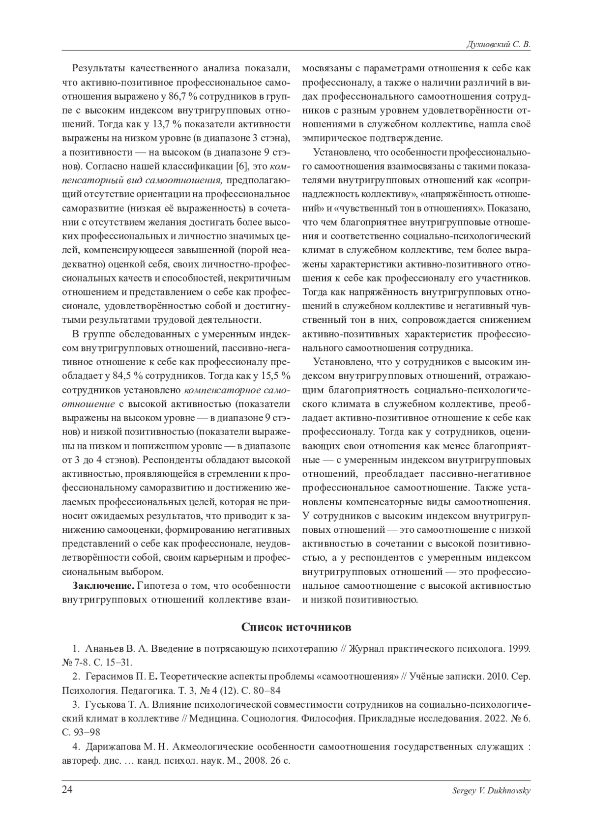 Цель - выявление и описание взаимосвязи между отношением к себе как профессионалу и отношениями в служебном коллективе, а также различий в видах самоотношения у сотрудников с разным уровнем удовлетворённости внутригрупповыми отношениями. Основными методами в исследовании выступили опросник «Субъективная оценка внутригрупповых отношений» и «Отношение к себе как профессионалу». В качестве статистических методов использовали анализ первичных статистик, корреляционный и сравнительный анализ. Респондентами выступили 230 сотрудников органов внутренних дел. Установлено, что наиболее значимые корреляционные связи показателей отношения к себе как профессионалу выявлены с показателями «сопринадлежность коллективу», «напряжённость в отношениях» и «негативный чувственный тон в отношениях» как индикаторов внутригрупповых отношений. Показано, что что позитивность отношений в служебном коллективе, повышают выраженность уровня активности (уровень притязаний и установка на саморазвитие) и позитивности (принятие и представления о себе) профессионального самоотношения сотрудников. Установлено, что у сотрудников с высоким индексом внутригрупповых отношений, преобладает активно-позитивное отношение к себе как профессионалу. Тогда как у сотрудников, с умеренным индексом внутригрупповых отношений, выражено пассивно-негативное профессиональное самоотношение. Показано, что компенсаторным видом самоотношения у сотрудников с высоким индексом внутригрупповых отношений - является самоотношение с низкой активностью в сочетании с высокой позитивностью, а у респондентов с умеренным индексом внутригрупповых отношений - профессиональное самоотношение с высокой активностью и низкой позитивностью.