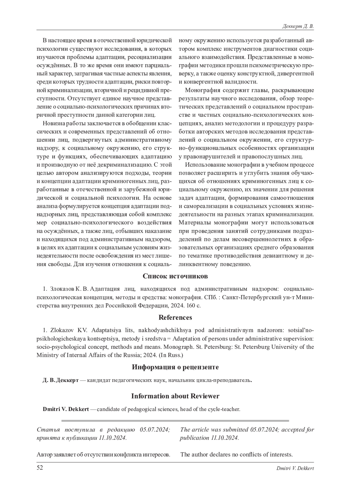 1. Злоказов К. В. Адаптация лиц, находящихся под административным надзором: социальнопсихологическая концепция, методы и средства: монография. СПб.: Санкт- Петербургский ун-т Министерства внутренних дел Российской Федерации, 2024. 160 с. EDN: NIFDUS