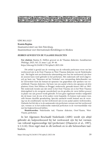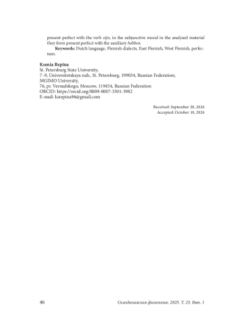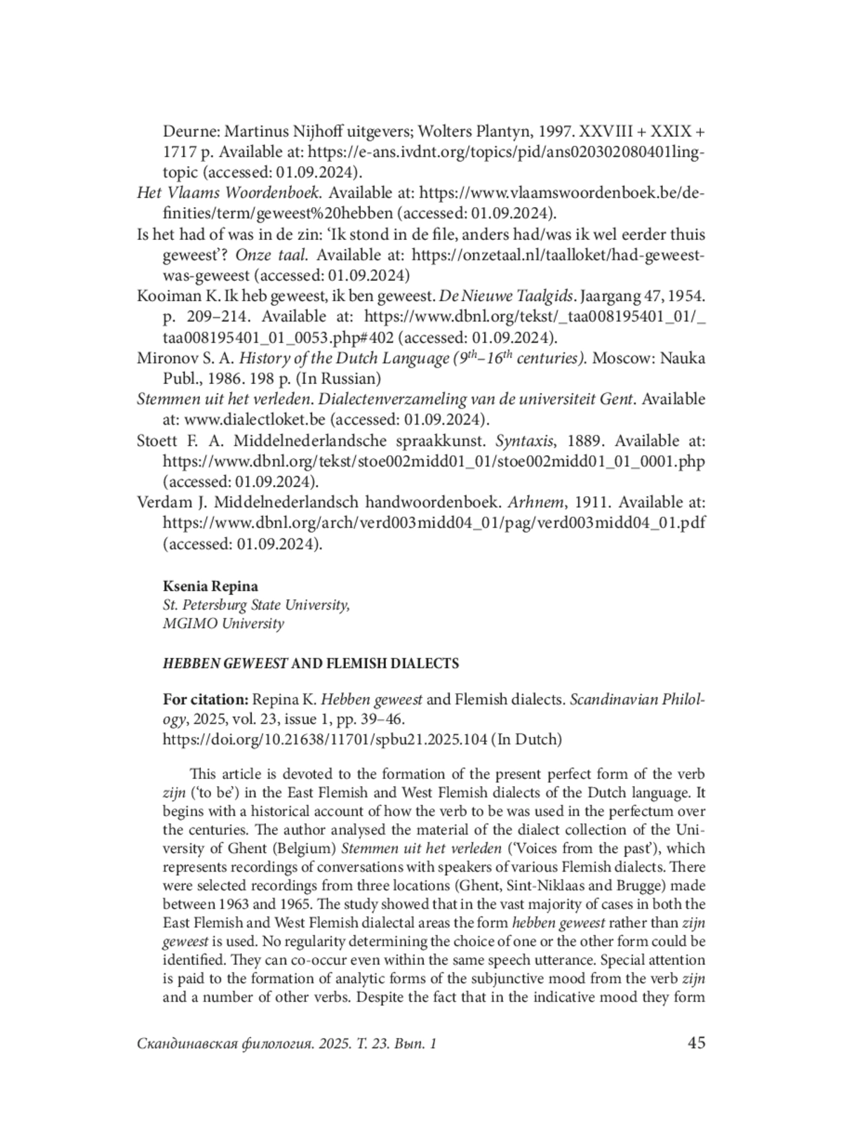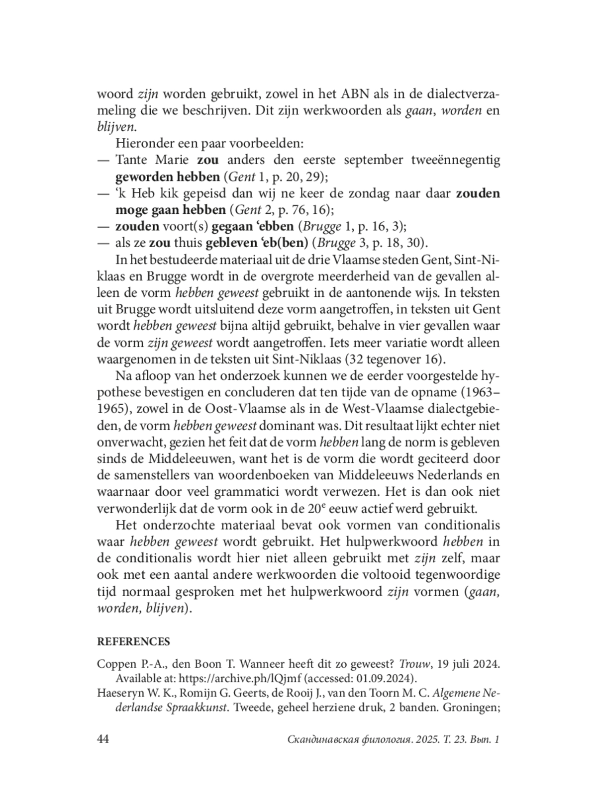 5. Kooiman K. Ik heb geweest, ik ben geweest. De Nieuwe Taalgids. Jaargang 47, 1954. р. 209-214. Available at: https://www.dbnl.org/tekst/_taa008195401_01/_taa008195401_01_0053.php#402 (accessed: 01.09.2024).
