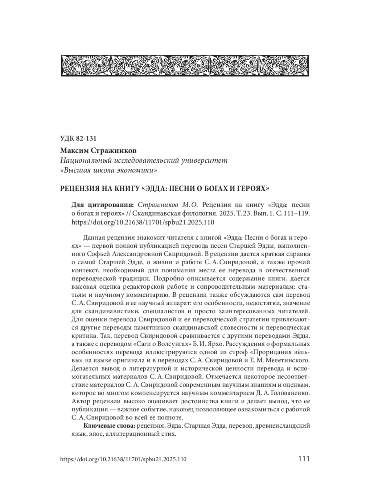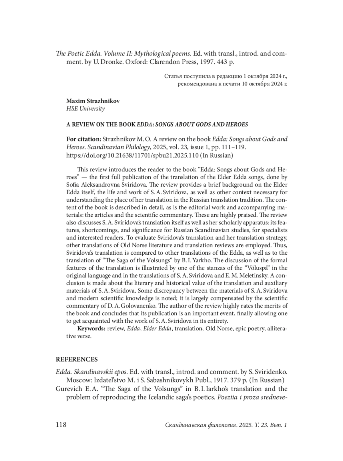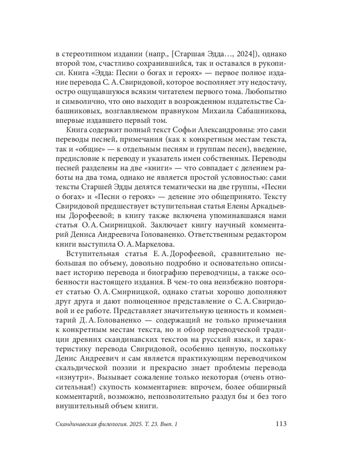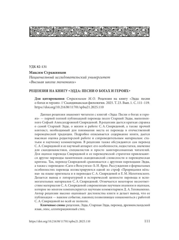 Данная рецензия знакомит читателя с книгой «Эдда: Песни о богах и героях» — первой полной публикацией перевода песен Старшей Эдды, выполненного Софьей Александровной Свиридовой. В рецензии дается краткая справка о самой Старшей Эдде, о жизни и работе С. А. Свиридовой, а также прочий контекст, необходимый для понимания места ее перевода в отечественной переводческой традиции. Подробно описывается содержание книги, дается высокая оценка редакторской работе и сопроводительным материалам: статьям и научному комментарию. В рецензии также обсуждаются сам перевод С. А. Свиридовой и ее научный аппарат: его особенности, недостатки, значение для скандинавистики, специалистов и просто заинтересованных читателей. Для оценки перевода Свиридовой и ее переводческой стратегии привлекаются другие переводы памятников скандинавской словесности и переводческая критика. Так, перевод Свиридовой сравнивается с другими переводами Эдды, а также с переводом «Саги о Волсунгах» Б. И. Ярхо. Рассуждения о формальных особенностях перевода иллюстрируются одной из строф «Прорицания вёльвы» на языке оригинала и в переводах С. А. Свиридовой и Е. М. Мелетинского. Делается вывод о литературной и исторической ценности перевода и вспомогательных материалов С. А. Свиридовой. Отмечается некоторое несоответствие материалов С. А. Свиридовой современным научным знаниям и оценкам, которое во многом компенсируется научным комментарием Д. А. Голованенко. Автор рецензии высоко оценивает достоинства книги и делает вывод, что ее публикация — важное событие, наконец позволяющее ознакомиться с работой С. А. Свиридовой во всей ее полноте