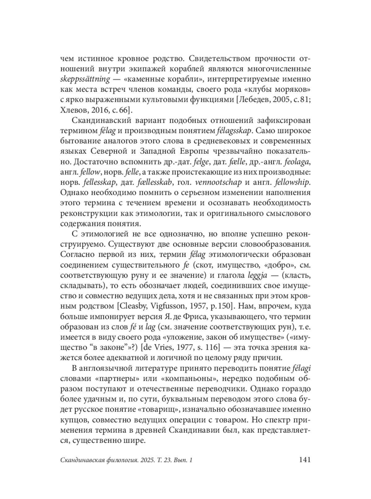 В статье рассматривается история употребления термина félag и его производных в древнеисландских родовых сагах и прядях. Словом félag обозначалось квазиродственное объединение участников походов викингов, связанных узами побратимства и взаимопомощи. Данный термин достаточно часто встречается как в письменных источниках, так и на материальных объектах. В частности, зафиксировано около двадцати случаев употребления слова félag на рунических камнях, установленных в конце X и первой половине XI в. Время появления термина крайне дискуссионно, однако с окончанием эпохи викингов он не исчез, но сохранился преимущественно в сфере купеческих взаимоотношений и коммерции. В литературе неоднократно высказывались идеи, в соответствии с которыми слово félag появляется достаточно поздно, в период наивысшей активности викингов, и не несет в себе смысла подлинного побратимства, скрепленного какими-либо ритуалами и формализованного. Автор рассматривает термин félag в качестве аналога русского понятия «товарищ». Изменение смыслового содержания этих терминов во многом аналогично, оба вмещают в себя спектр значений от исключительно важного и окрашенного эмоциями побратимства воиновкупцов до скептически-ироничного обозначения случайного приятельства или даже неприязни. Главной задачей предлагаемой статьи является исследование случаев употребления слова félag в литературе средневековой Исландии. Анализ частотности и контекста употребления термина félag в исландских сагах, как полагает автор, может углубить и расширить представления о социальных и межличностных отношениях эпохи викингов и сопряженных с ней хронологических периодов. В статье делается вывод о значительной древности происхождения термина, а также об изначальной высокой значимости связей типа félagsskap в структуре социальных связей архаической Скандинавии.