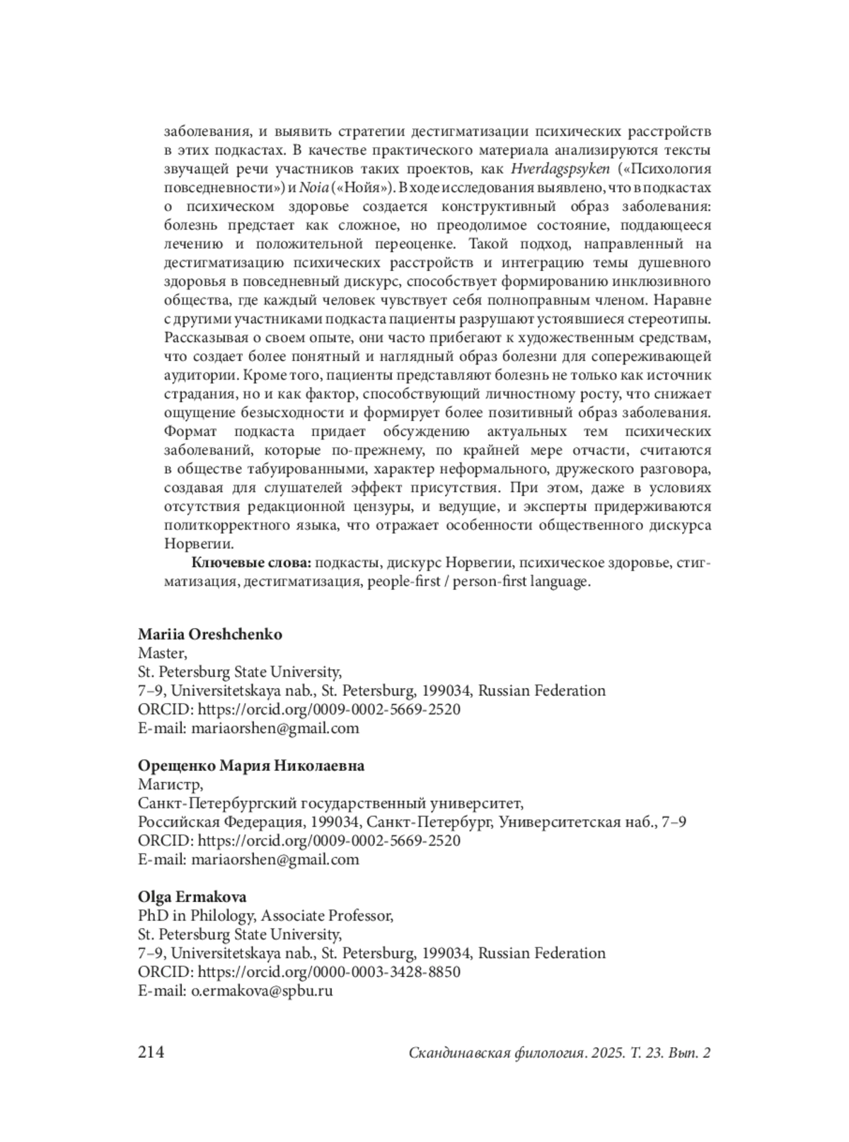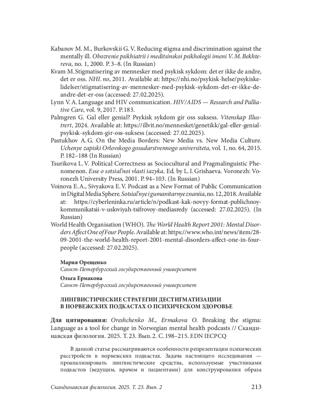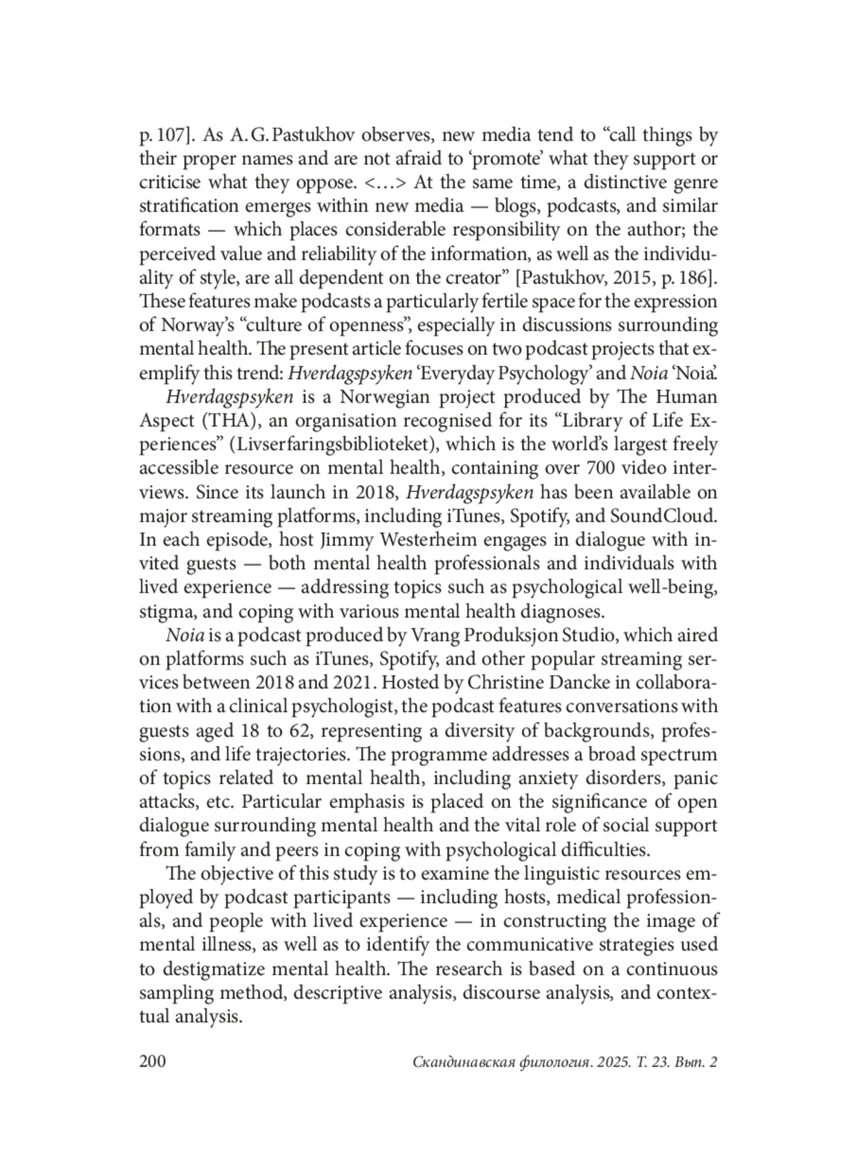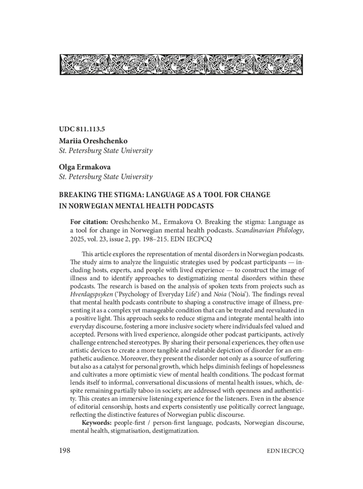 This article explores the representation of mental disorders in Norwegian podcasts. The study aims to analyze the linguistic strategies used by podcast participants — including hosts, experts, and people with lived experience — to construct the image of illness and to identify approaches to destigmatizing mental disorders within these podcasts. The research is based on the analysis of spoken texts from projects such as Hverdagspsyken (‘Psychology of Everyday Life’) and Noia (‘Noia’). The findings reveal that mental health podcasts contribute to shaping a constructive image of illness, presenting it as a complex yet manageable condition that can be treated and reevaluated in a positive light. This approach seeks to reduce stigma and integrate mental health into everyday discourse, fostering a more inclusive society where individuals feel valued and accepted. Persons with lived experience, alongside other podcast participants, actively challenge entrenched stereotypes. By sharing their personal experiences, they often use artistic devices to create a more tangible and relatable depiction of disorder for an empathetic audience. Moreover, they present the disorder not only as a source of suffering but also as a catalyst for personal growth, which helps diminish feelings of hopelessness and cultivates a more optimistic view of mental health conditions. The podcast format lends itself to informal, conversational discussions of mental health issues, which, despite remaining partially taboo in society, are addressed with openness and authenticity. This creates an immersive listening experience for the listeners. Even in the absence of editorial censorship, hosts and experts consistently use politically correct language, reflecting the distinctive features of Norwegian public discourse.