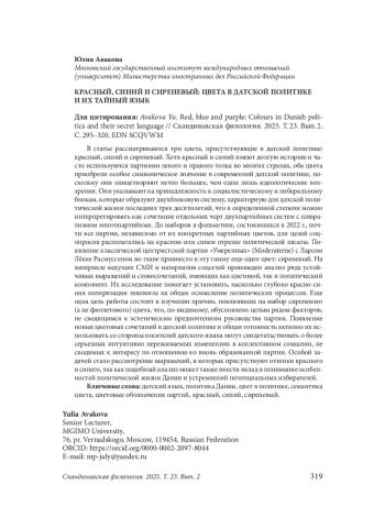 The article focuses on three colours among those present in Danish politics: red, blue and purple. While red and blue seem to have a long history, as these political colours have been historically used by socialist and liberal parties, their symbolic meaning in Danish politics over the last thirty years has become more nuanced, due to the fact that they represent something more than mere allegiance to the ideas they stand for. They indicate belonging to the socialist and the liberal bloc that form the two-bloc system, which can be perceived as an attempt to combine some features of a two-party system with the pluralism of a multi-party one. Until the last 2022 Folketing elections almost all parties, regardless of their specific party colours, could be put either on the red, or on the blue scale in election-polls, while the emergence of The Moderates (Moderaterne) led by Lars Løkke Rasmussen, a classical centrist party, has introduced another colour into the mix: purple. The use of political colour and corresponding collocations in Danish media are explored in order to establish, how deeply the red-blue divide has influenced the general understanding of party and government politics. Another goal is to explain the choice of the purple (and not violet) colour, which seems to communicate much more than the aesthetic taste of the party’s leadership. The emergence of new colour collocations in Danish politics and the overall willingness to use them by the Danish-speaking community can be indicative of the long-awaited changes in collective political preferences, not limited to the emergence of the new party. The use of different hues of red and blue also features in the research, as it helps understand the peculiarities of the Danish political life and the aspirations of prospective voters